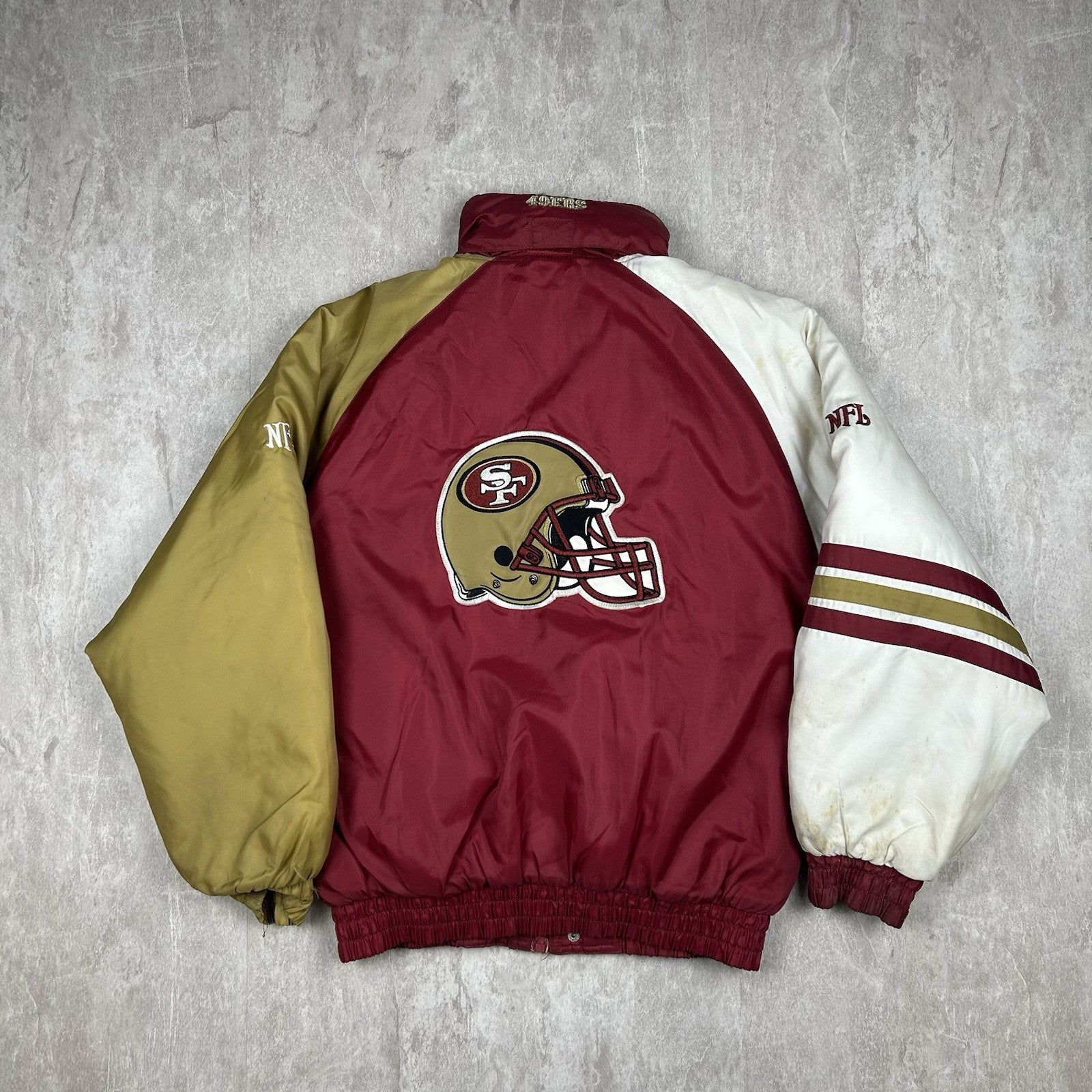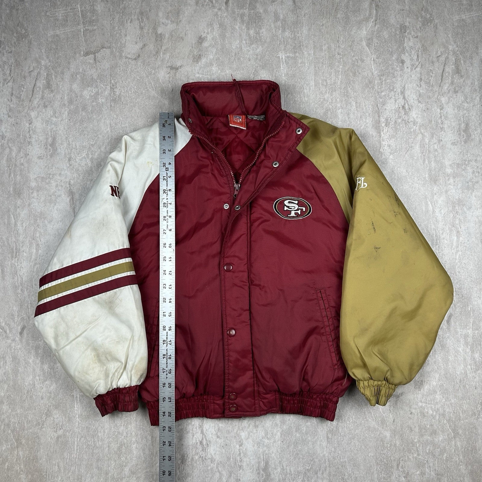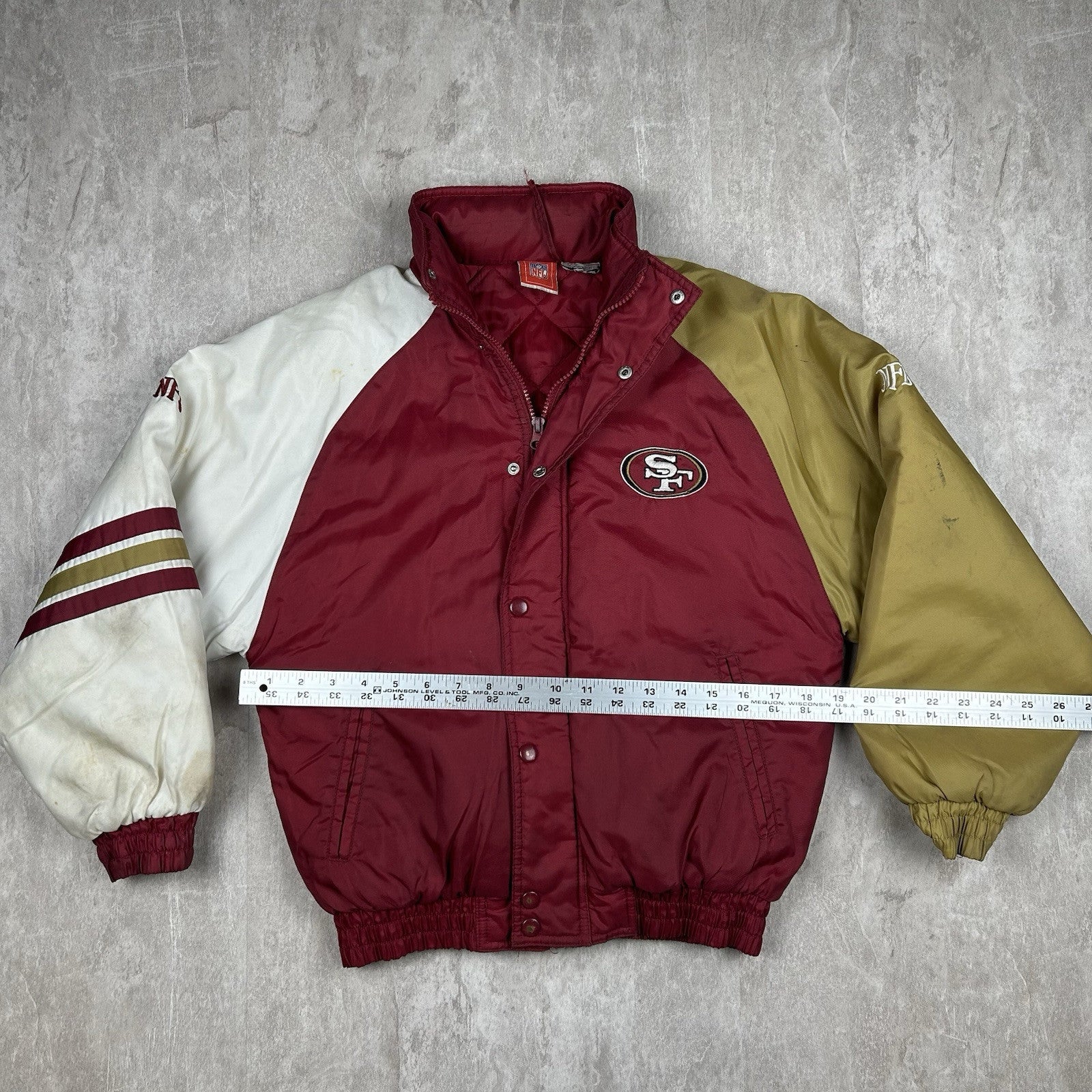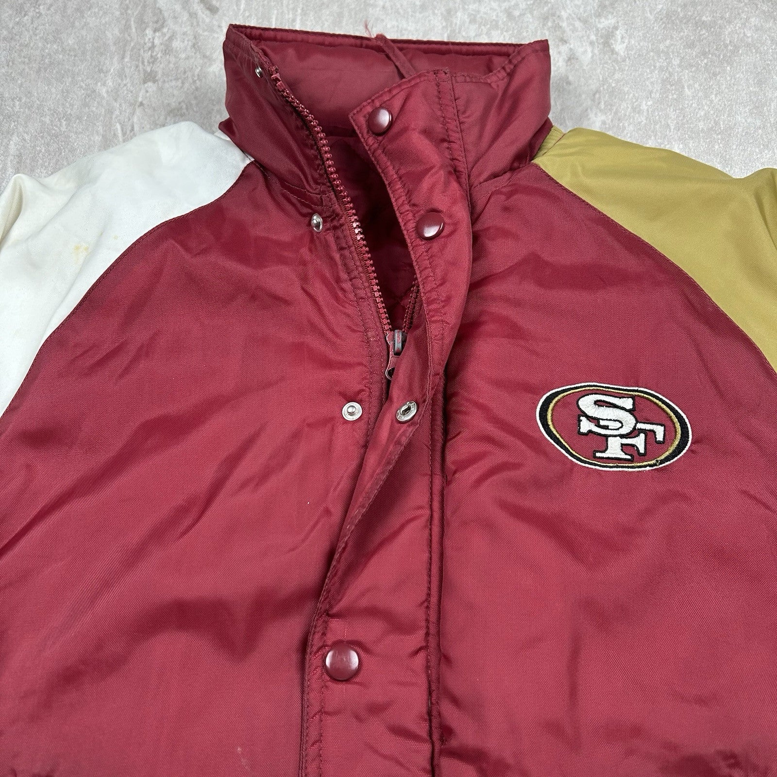 This vintage San Francisco 49ers NFL puffer jacket is a must-have for young football fans. Featuring a classic design with warm insulation, it's perfect for showing team pride in colder weather. Youth size unknown.