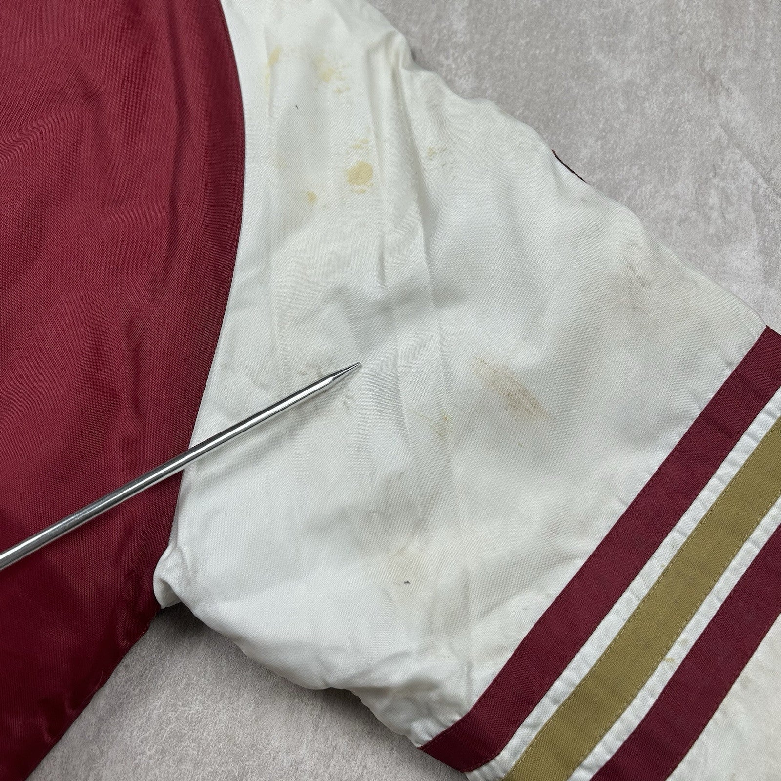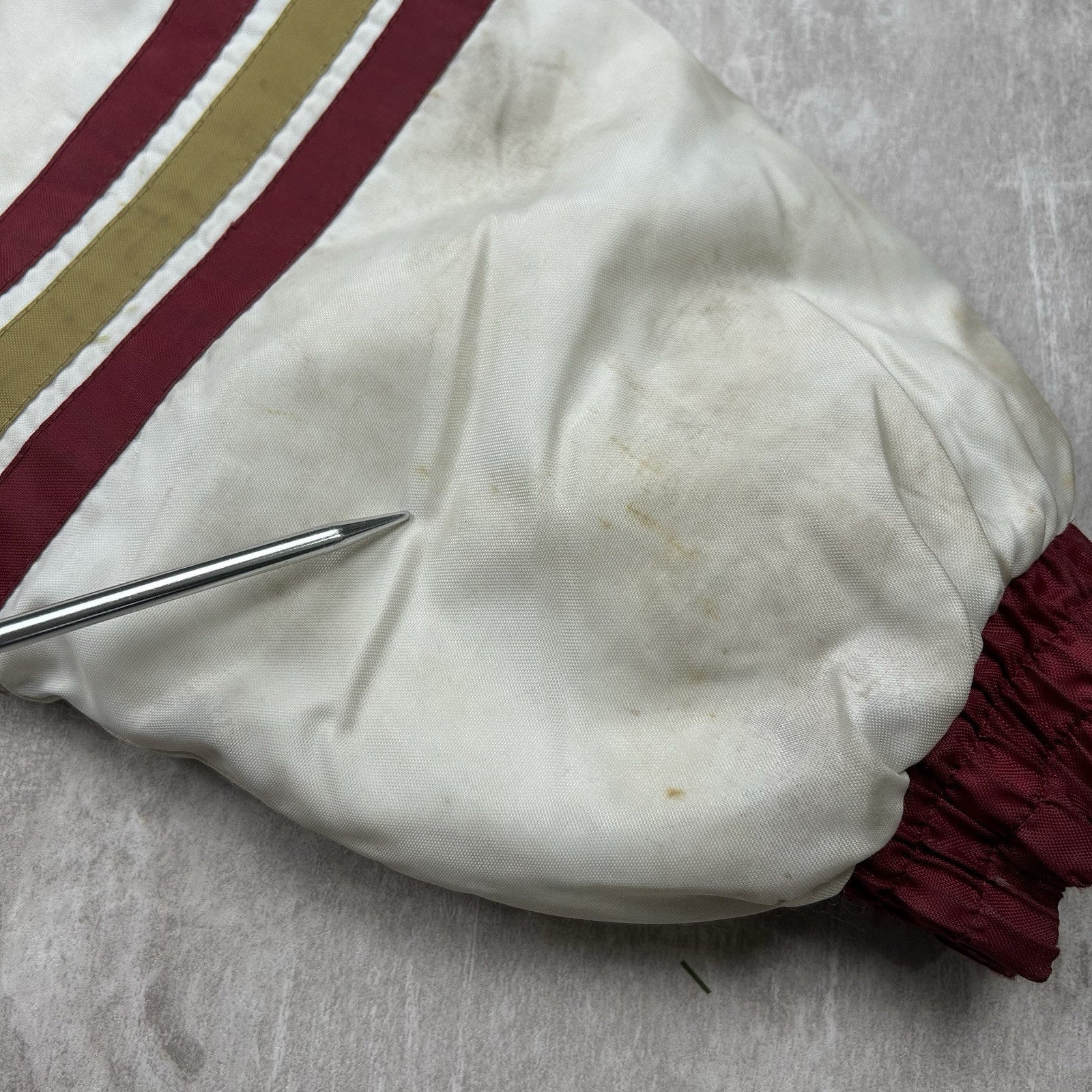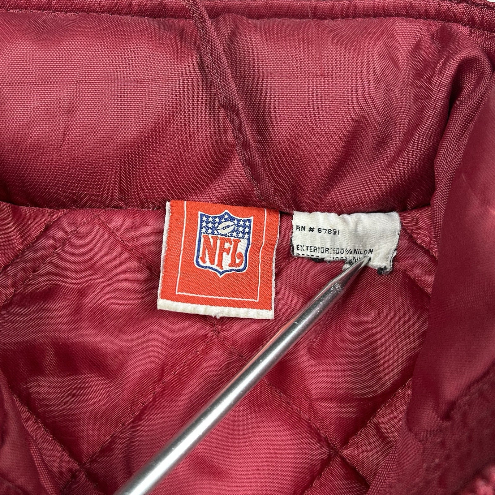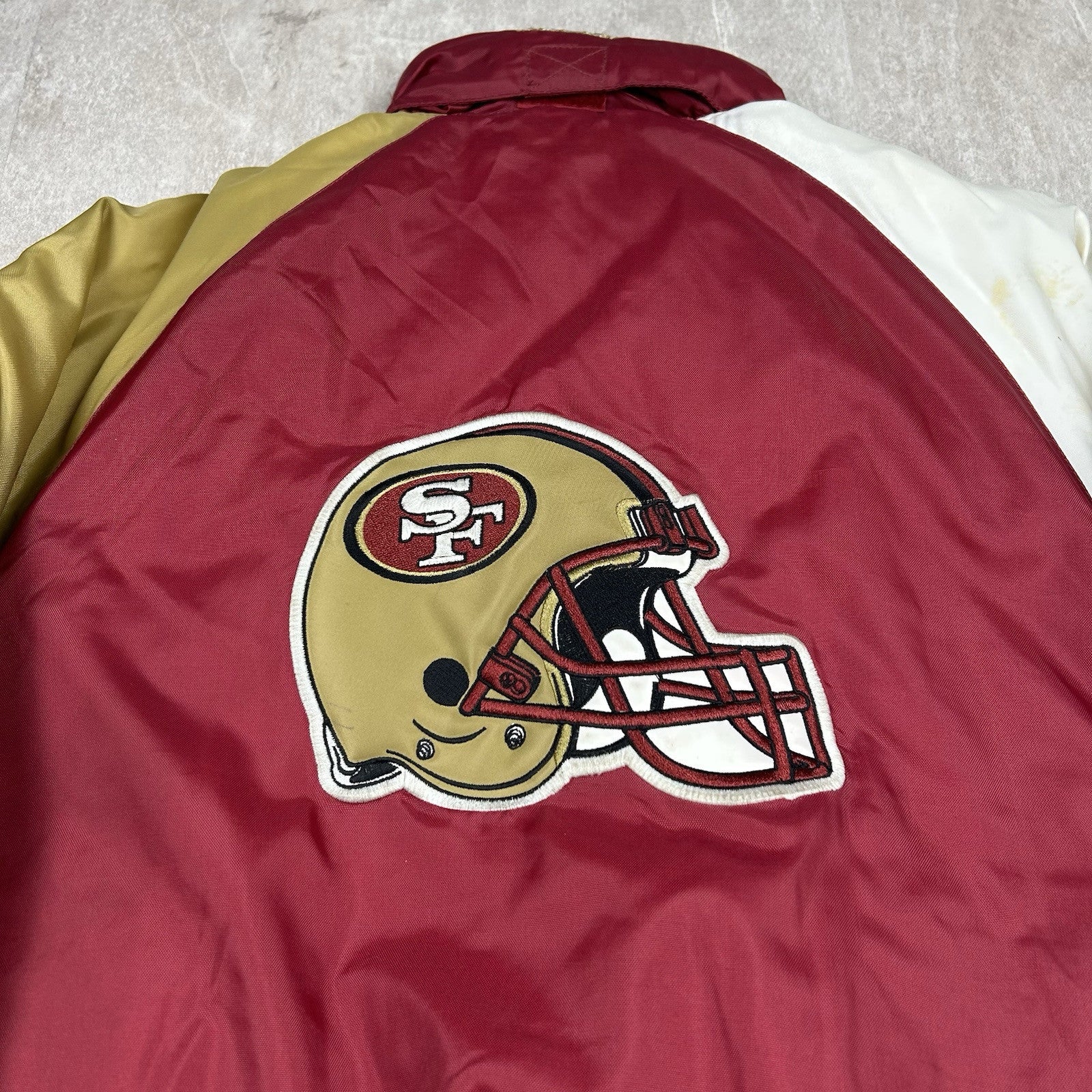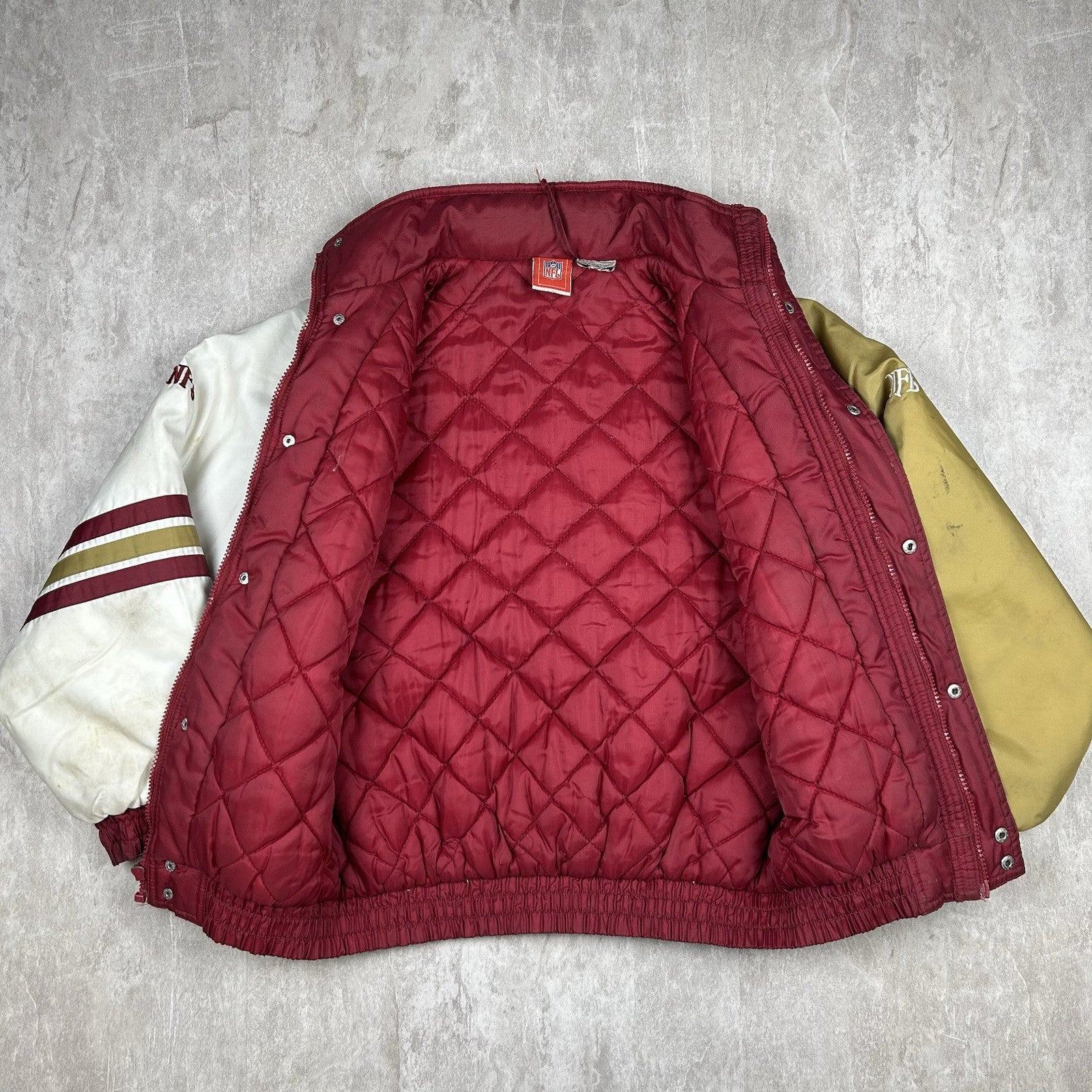 This vintage San Francisco 49ers NFL puffer jacket is a must-have for young football fans. Featuring a classic design with warm insulation, it's perfect for showing team pride in colder weather. Youth size unknown.