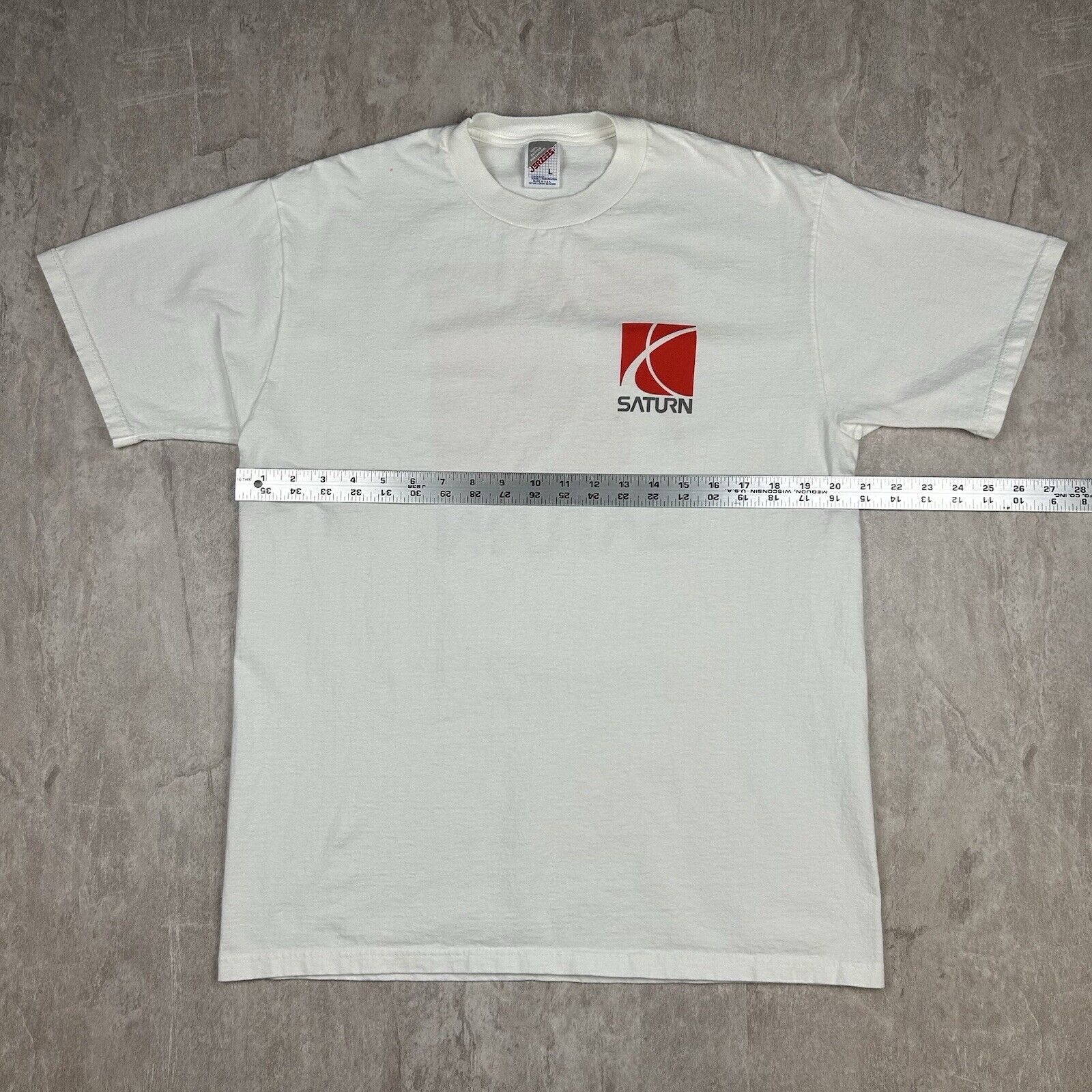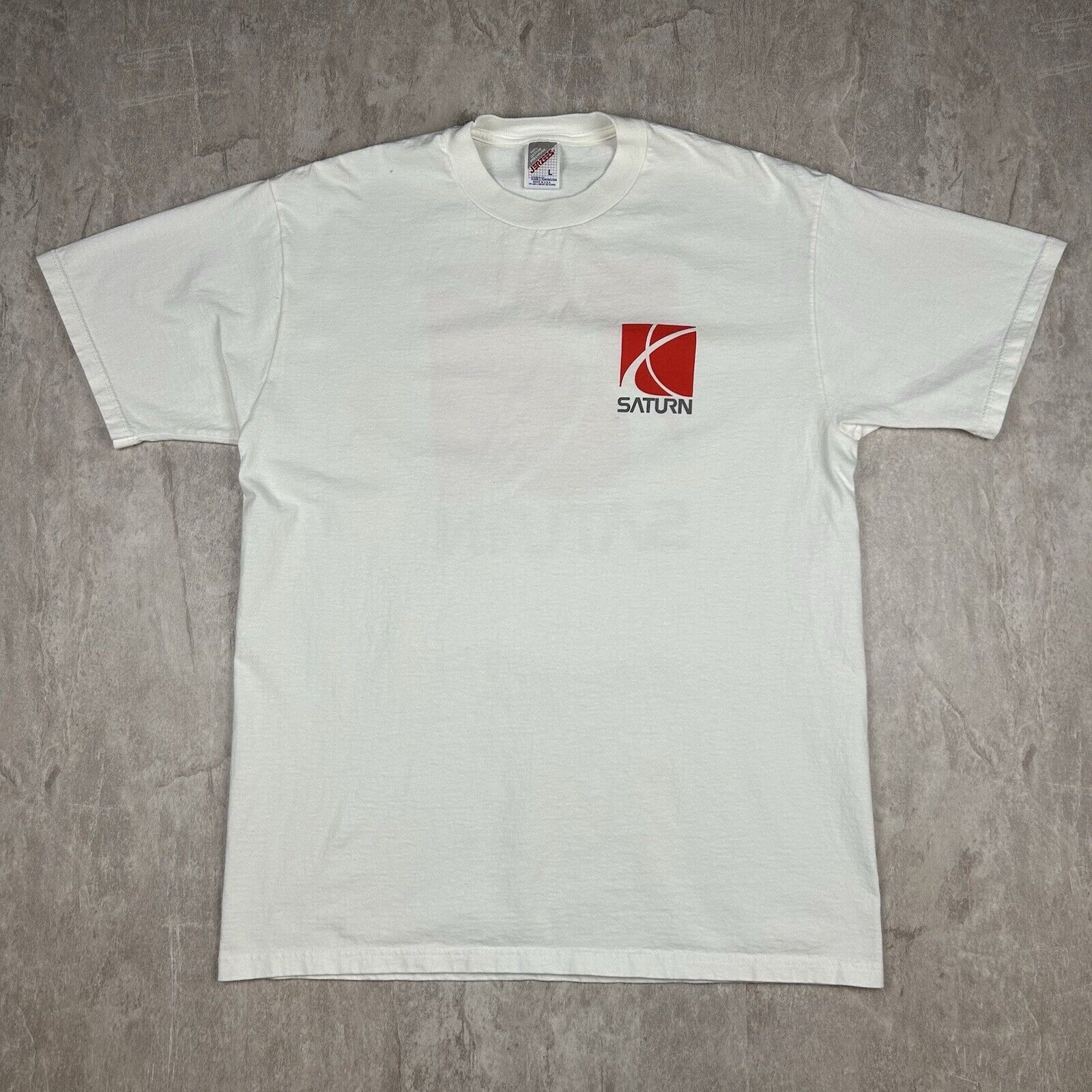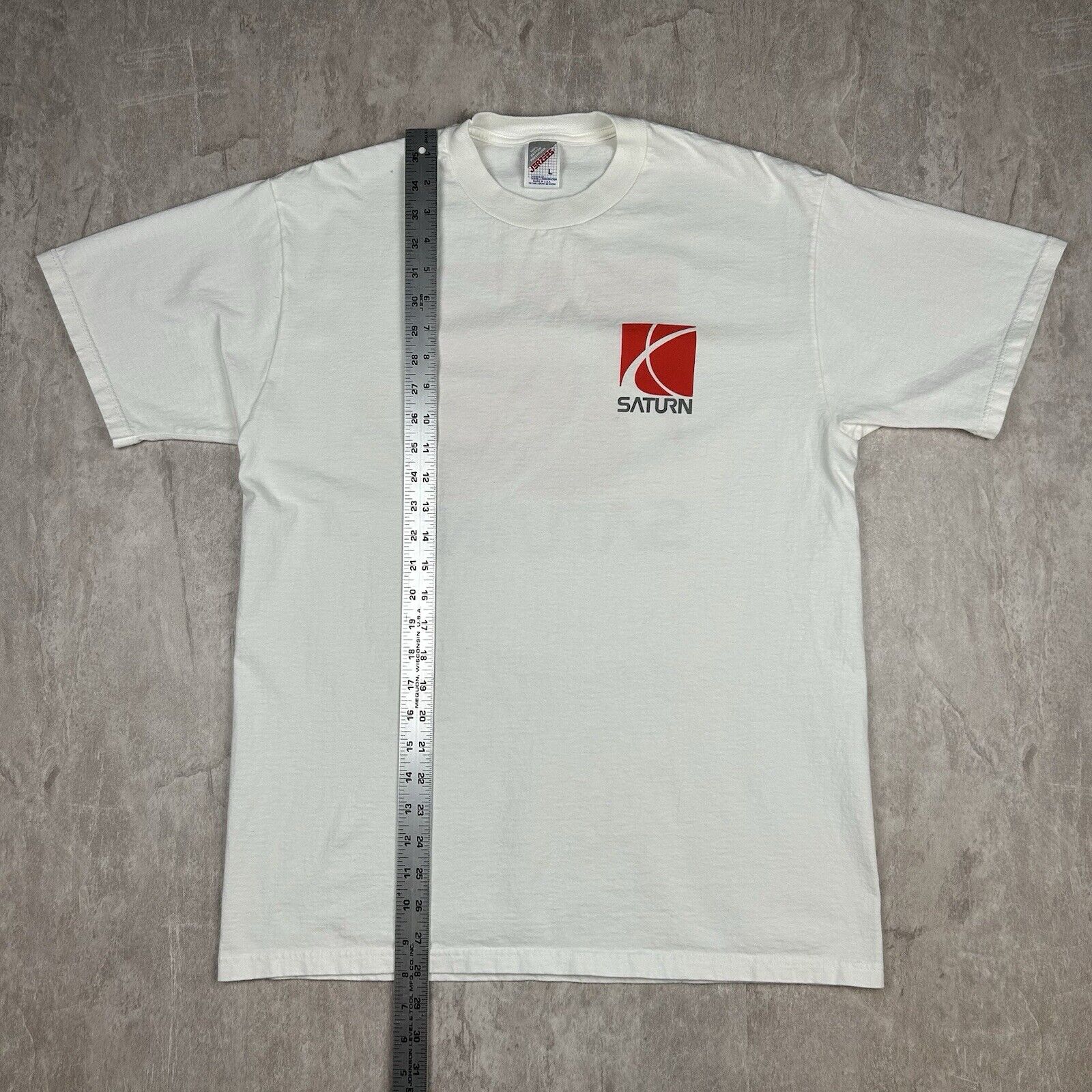 This Vintage Saturn Car Logo T-Shirt in size L features a clean white design with double-sided graphics celebrating the iconic car brand. Made in the USA, it's a great piece for automotive enthusiasts and vintage collectors.