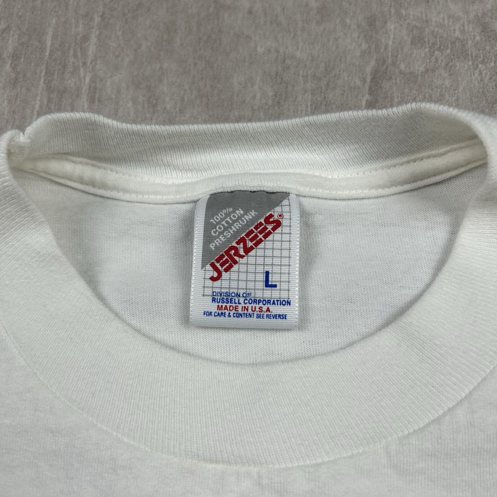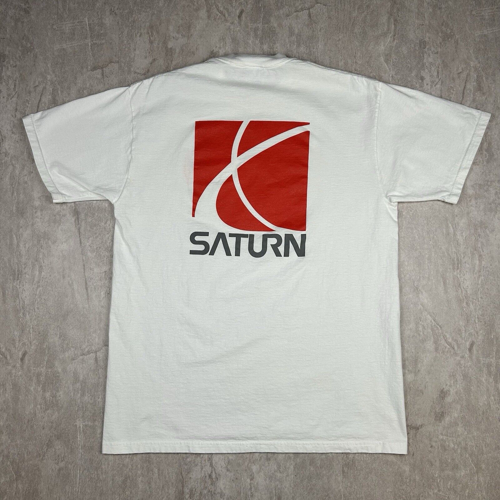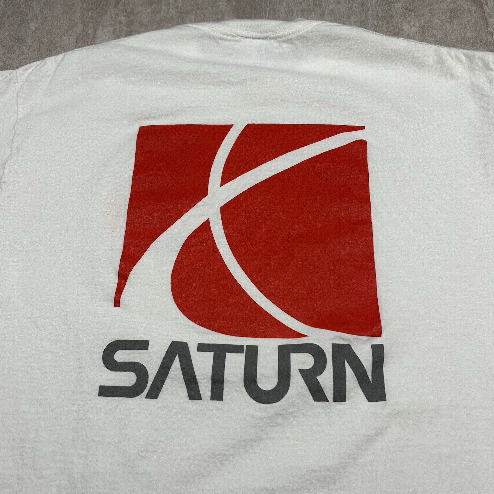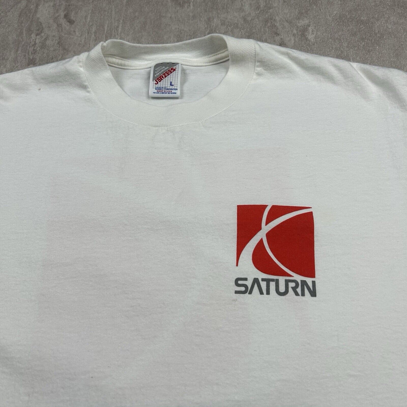 This Vintage Saturn Car Logo T-Shirt in size L features a clean white design with double-sided graphics celebrating the iconic car brand. Made in the USA, it's a great piece for automotive enthusiasts and vintage collectors.