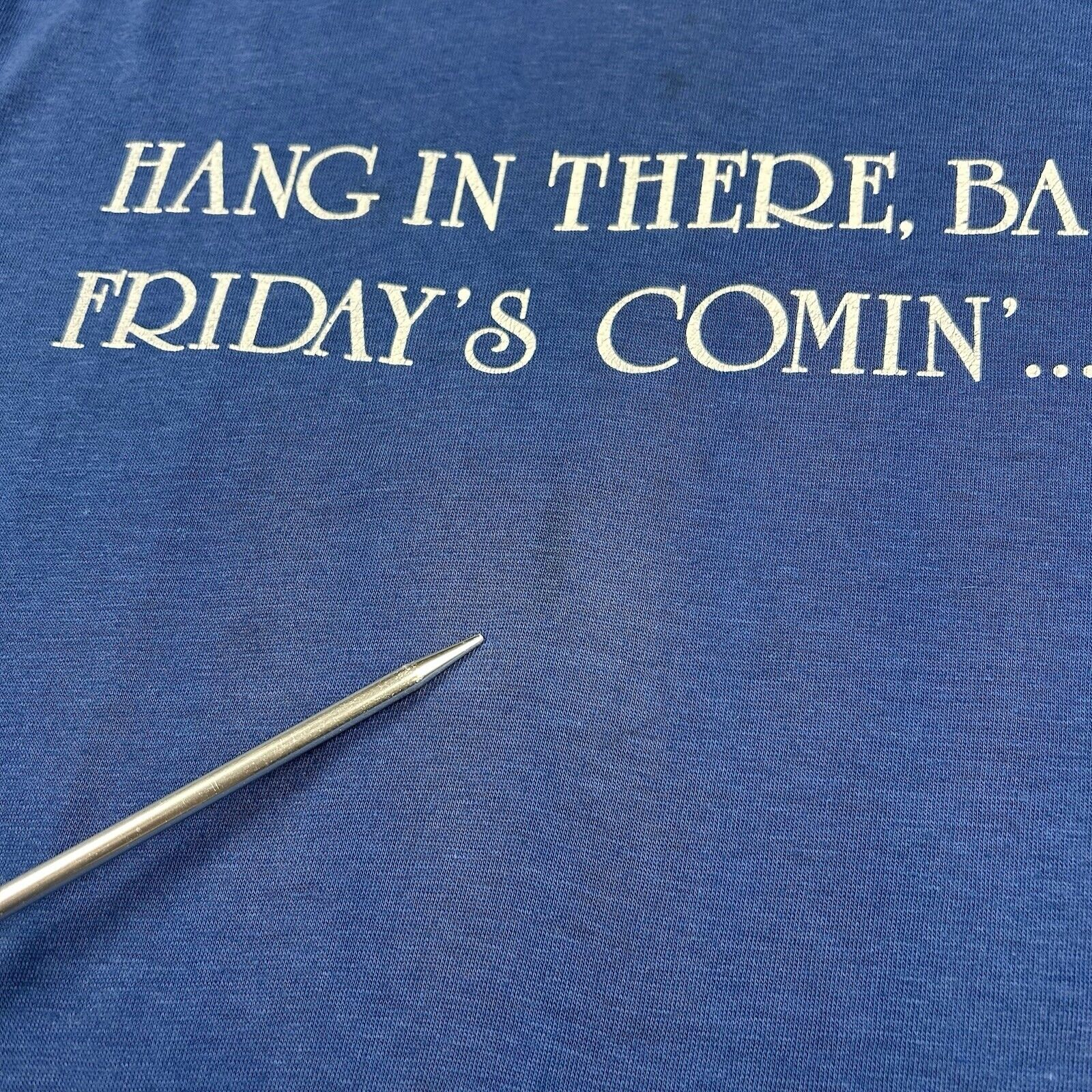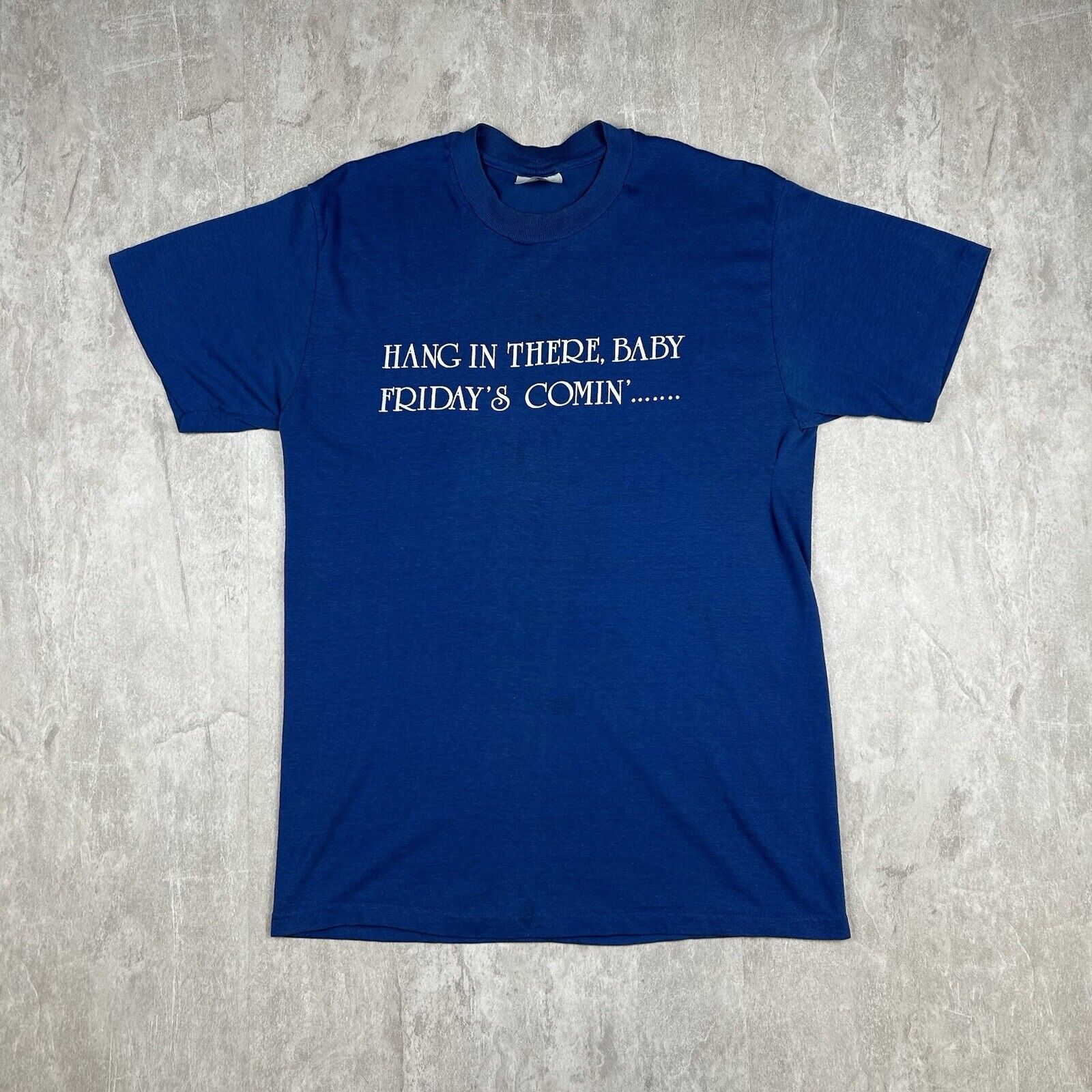 Bring some humor to your wardrobe with this Vintage Stedman 'Hang In There Friday's Coming' T-Shirt. In men's size L, this classic tee combines a lighthearted message with a comfortable fit, perfect for those who appreciate fun, vintage-style apparel.