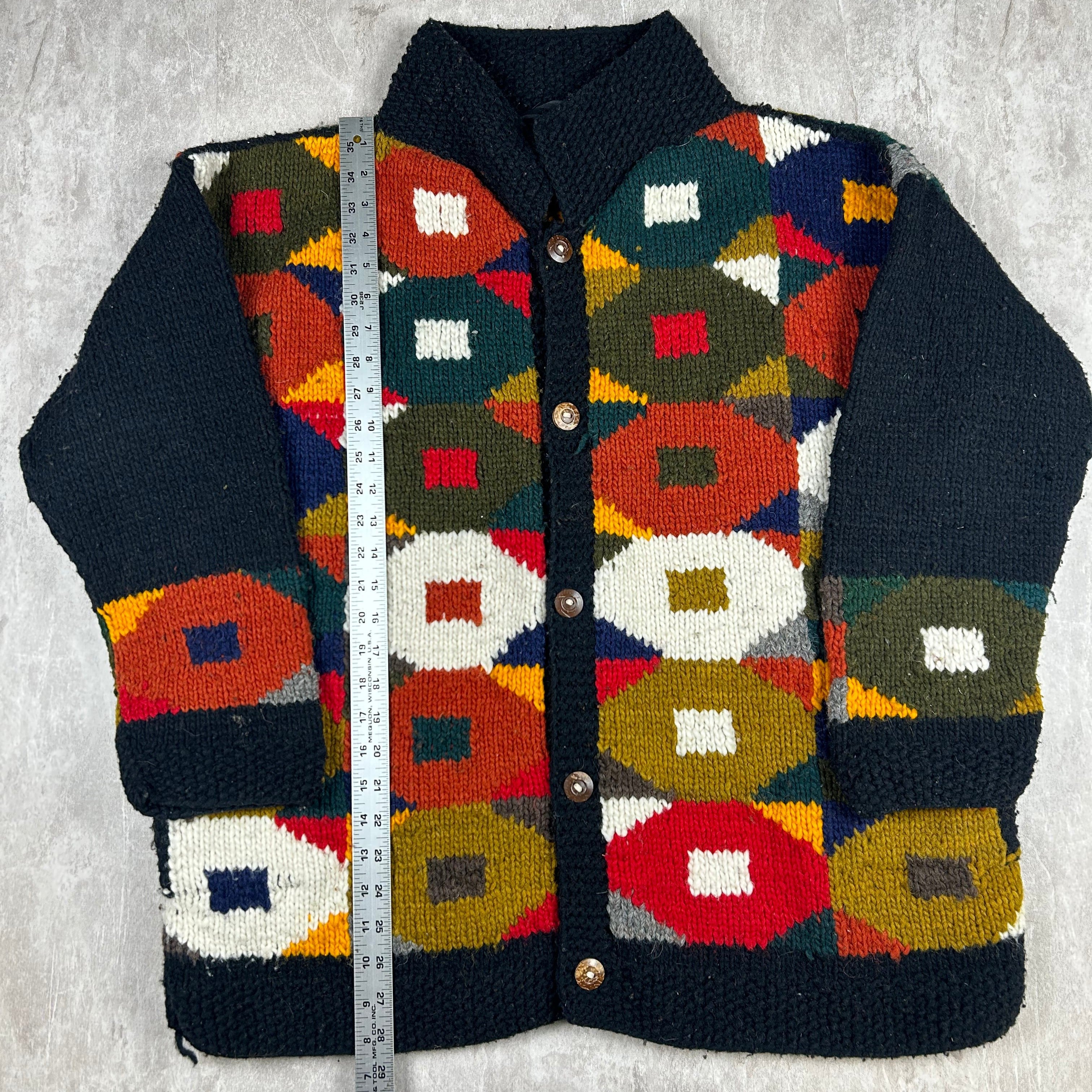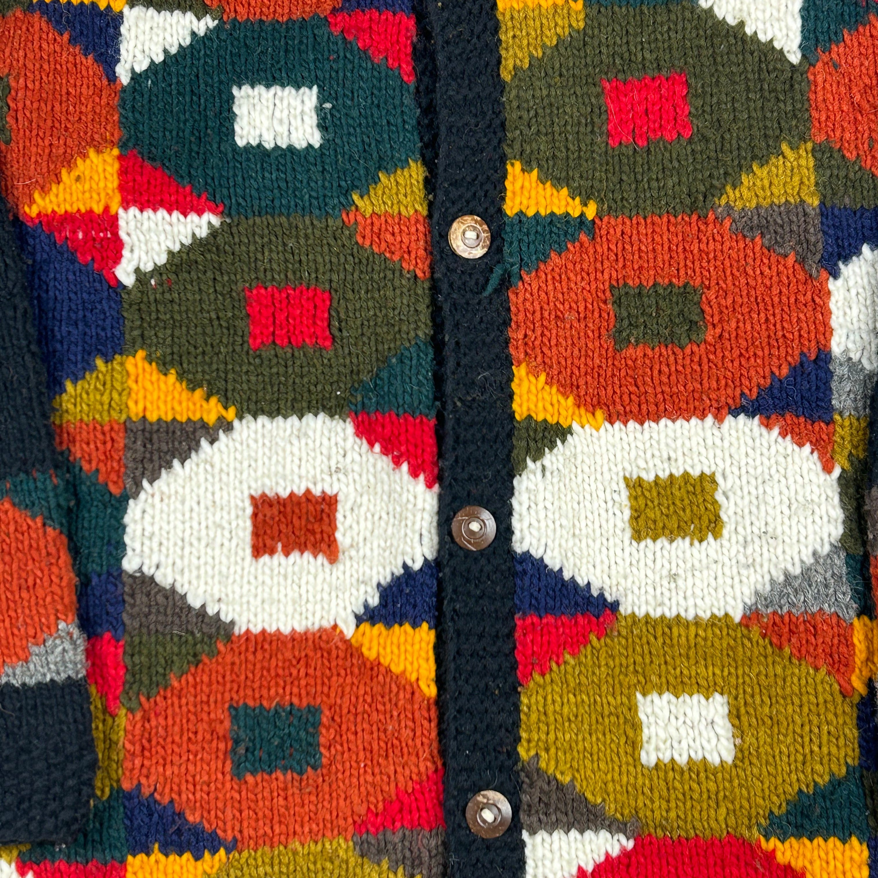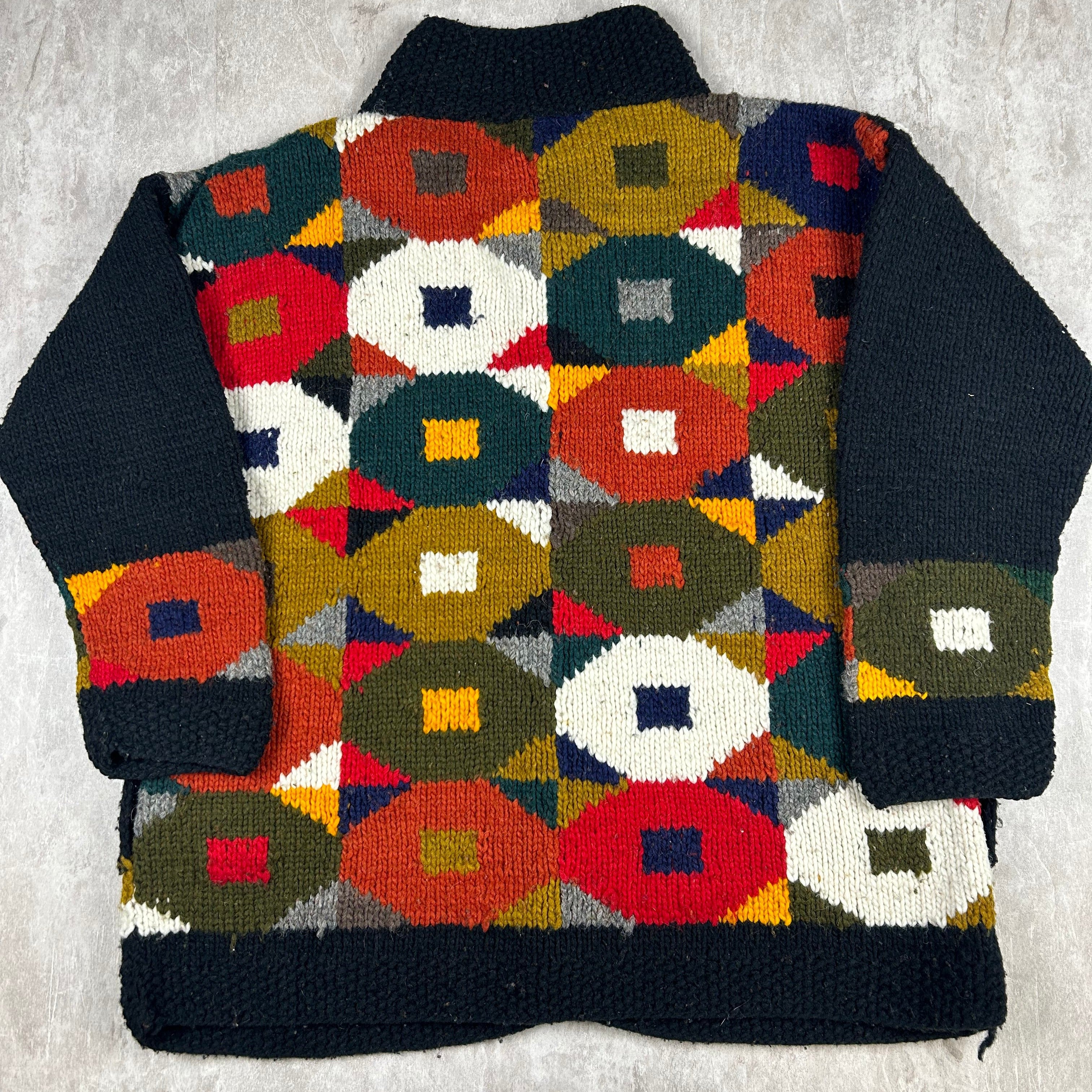 Vintage Tejidos Ecuador Hand Knit Circle Pattern Heavy Wool Cardigan Sweater