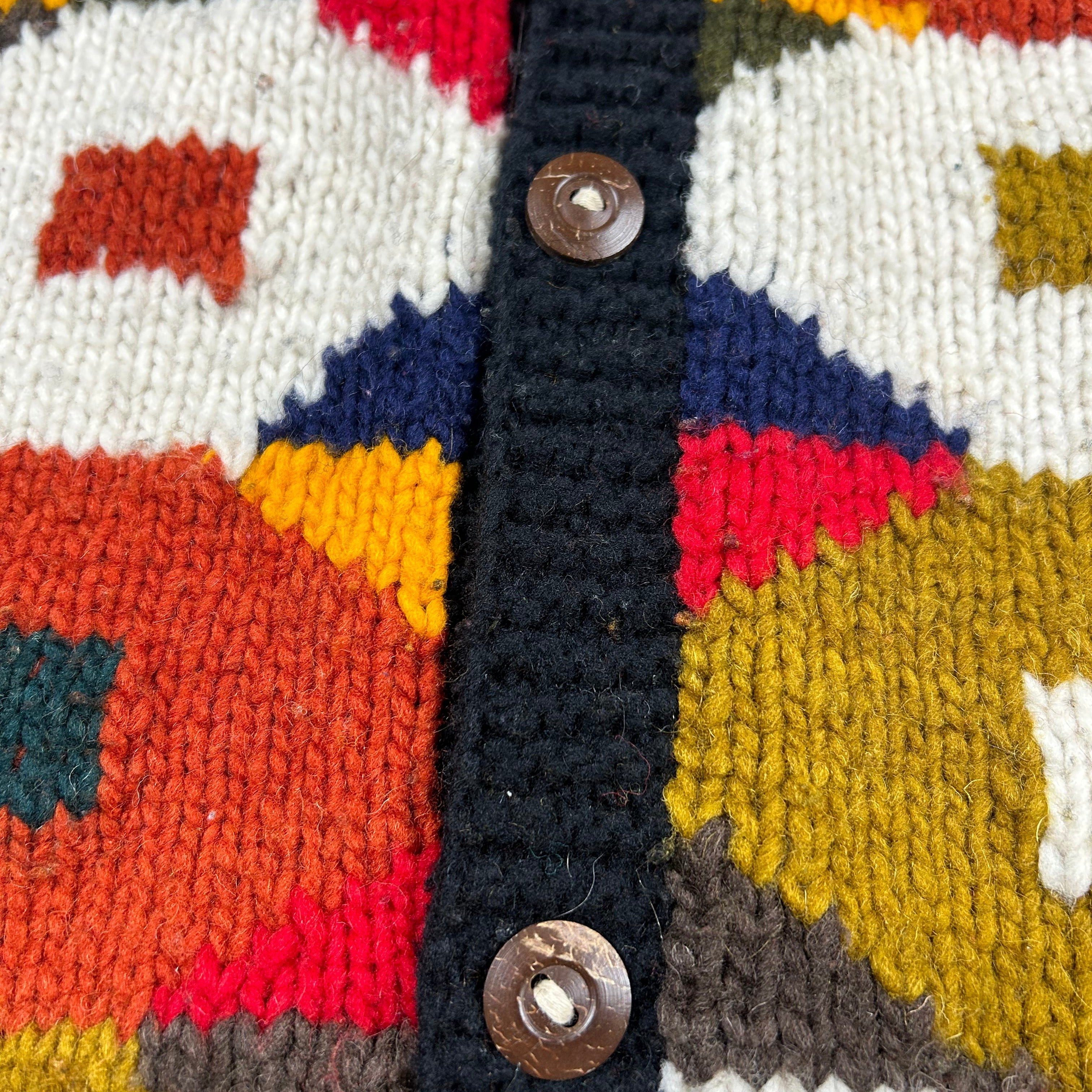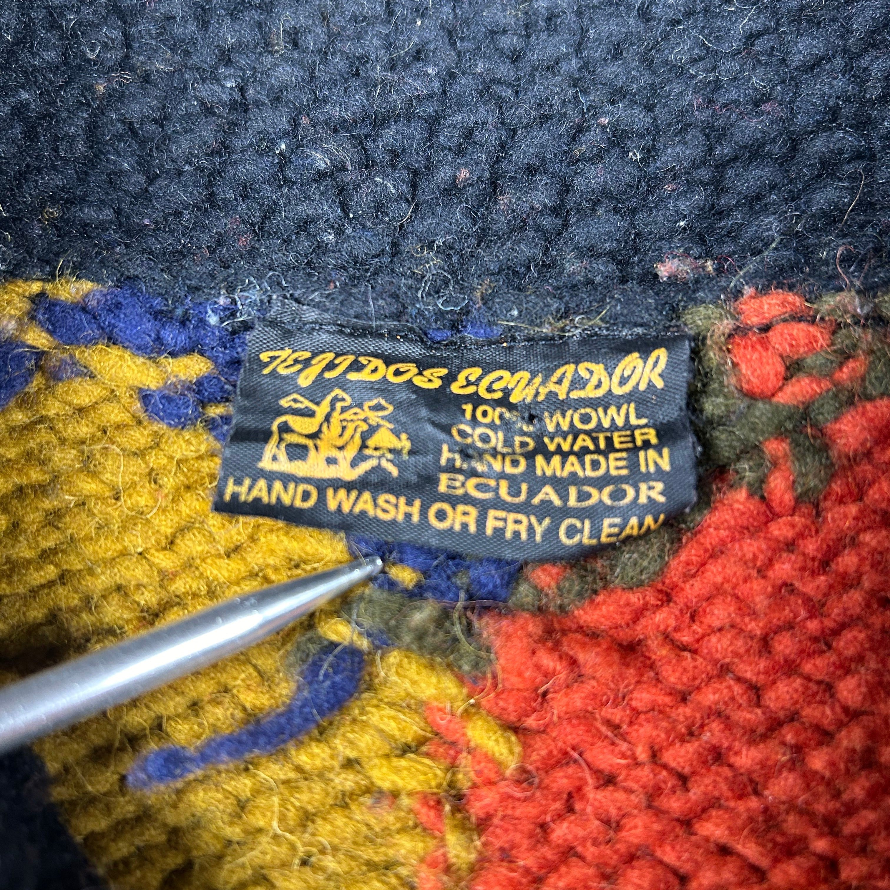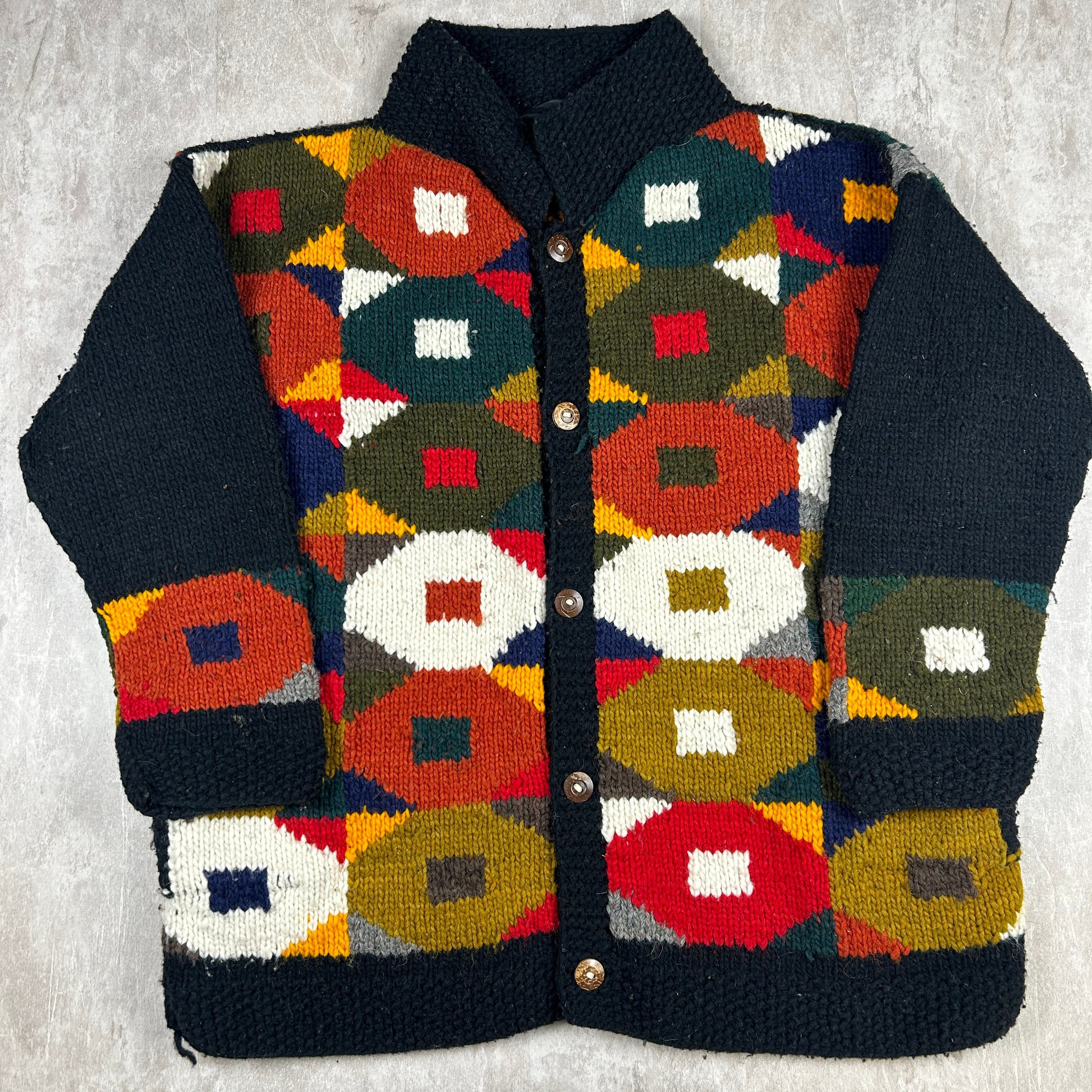 Vintage Tejidos Ecuador Hand Knit Circle Pattern Heavy Wool Cardigan Sweater