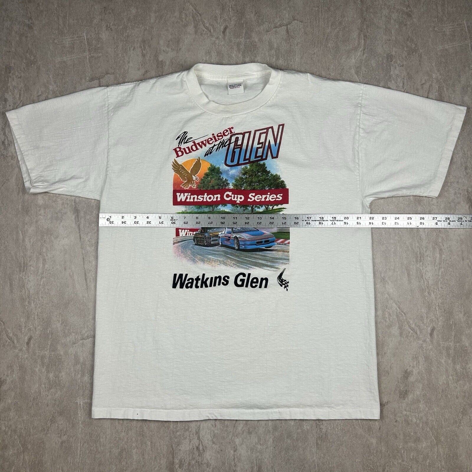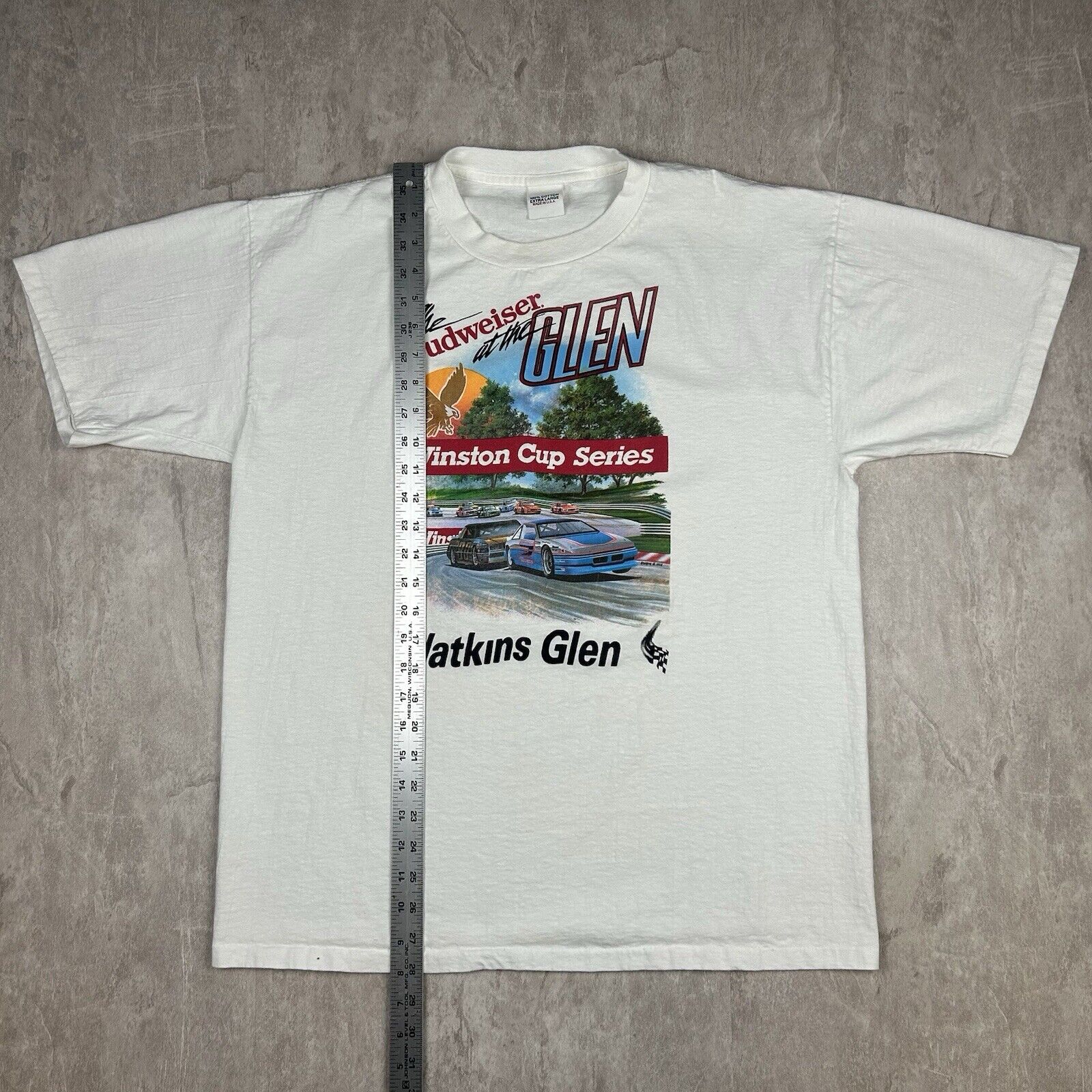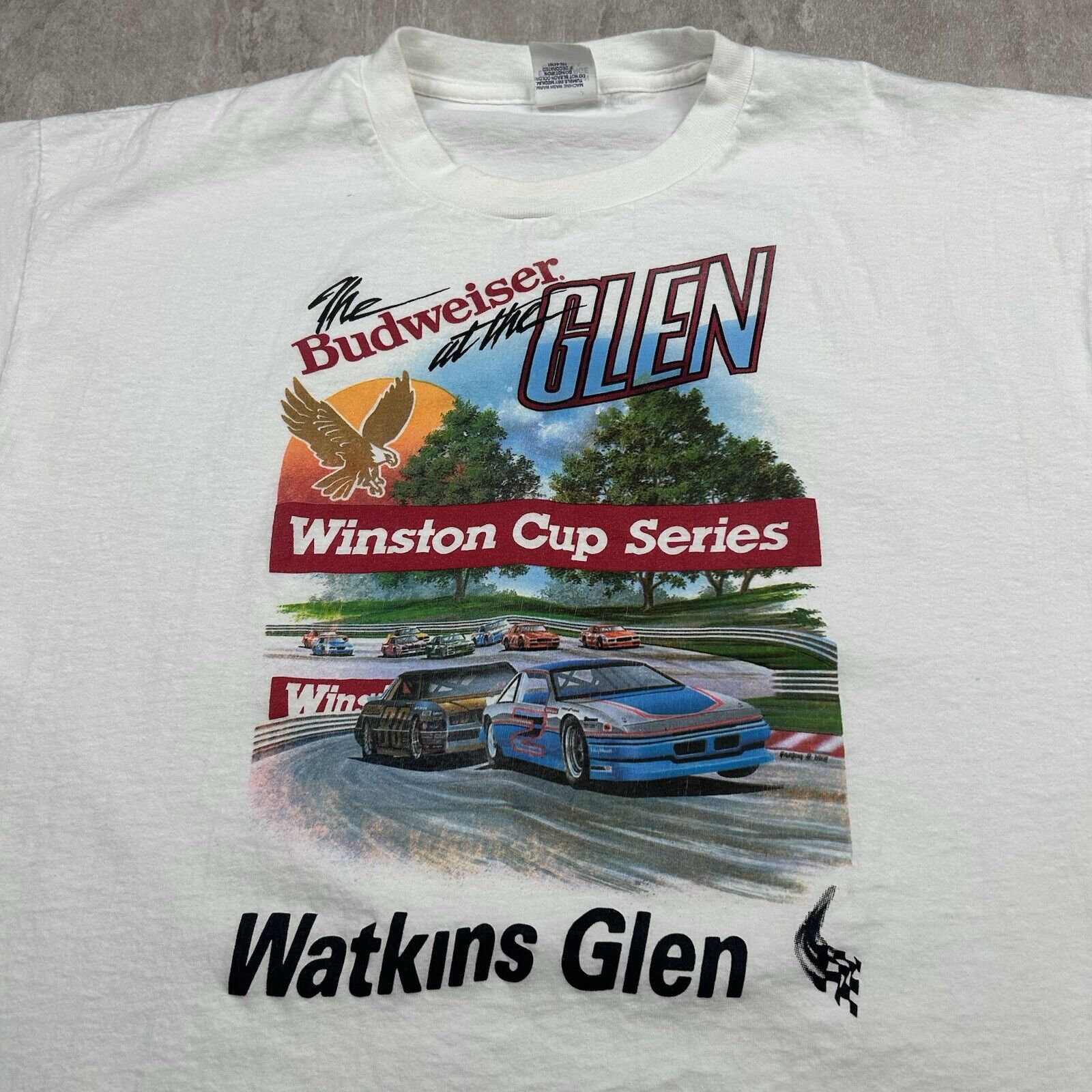 This Vintage Watkins Glen NASCAR Budweiser Racing T-Shirt in size XL, made in the USA, celebrates the iconic Winston Cup series. Featuring bold graphics and classic racing style, it's a must-have for motorsport fans and vintage NASCAR collectors.