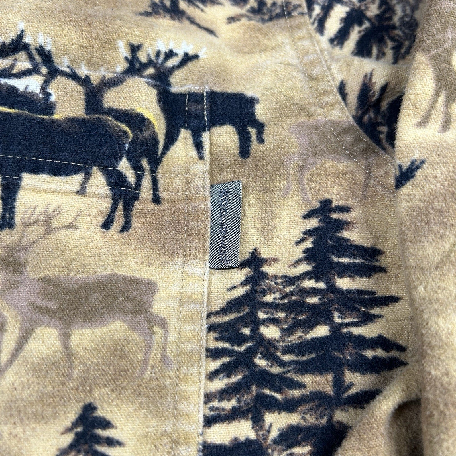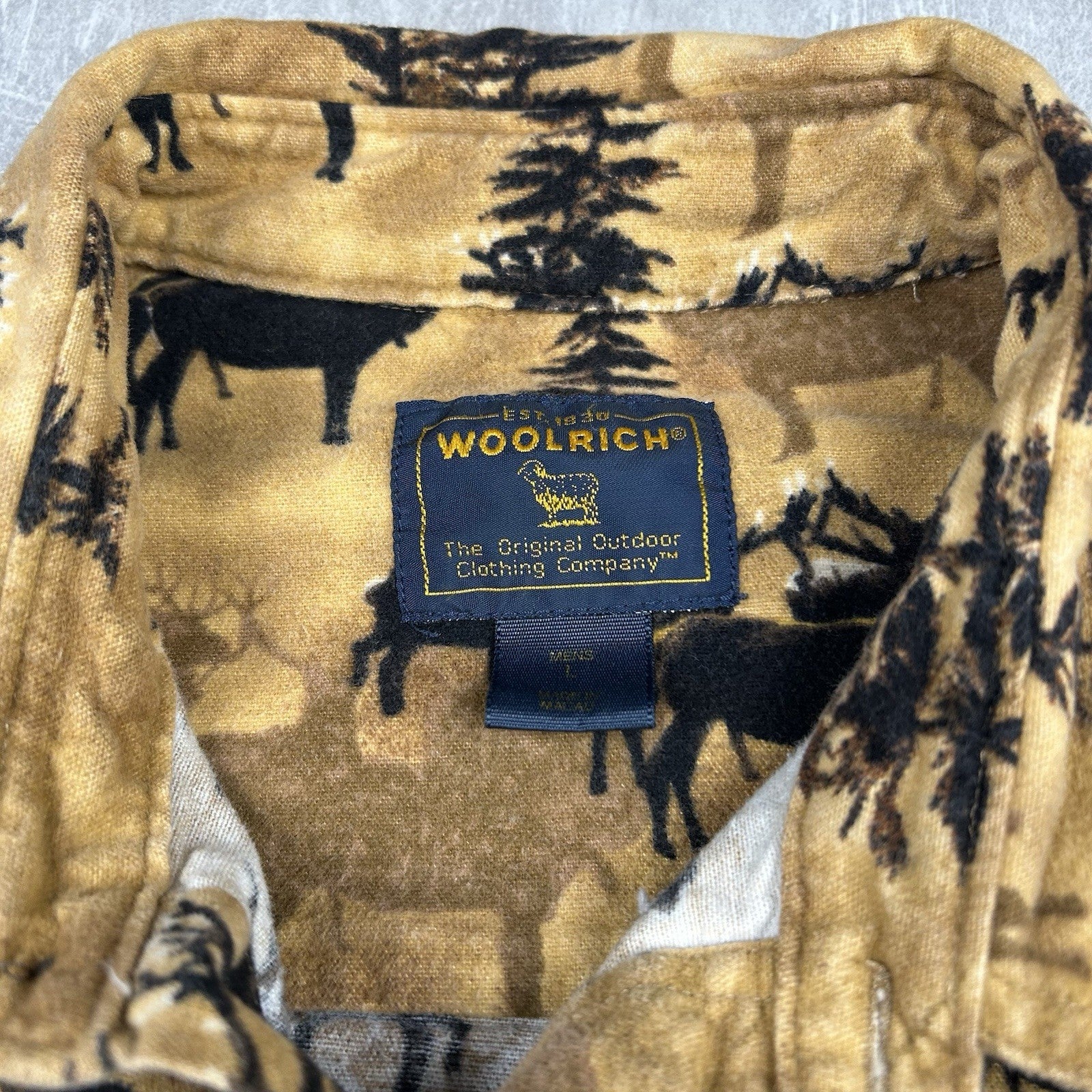 Rugged outdoorsman vibes in this vintage Woolrich button-up, featuring a scenic whitetail deer forest print. Timeless flannel feel in men's size L.
