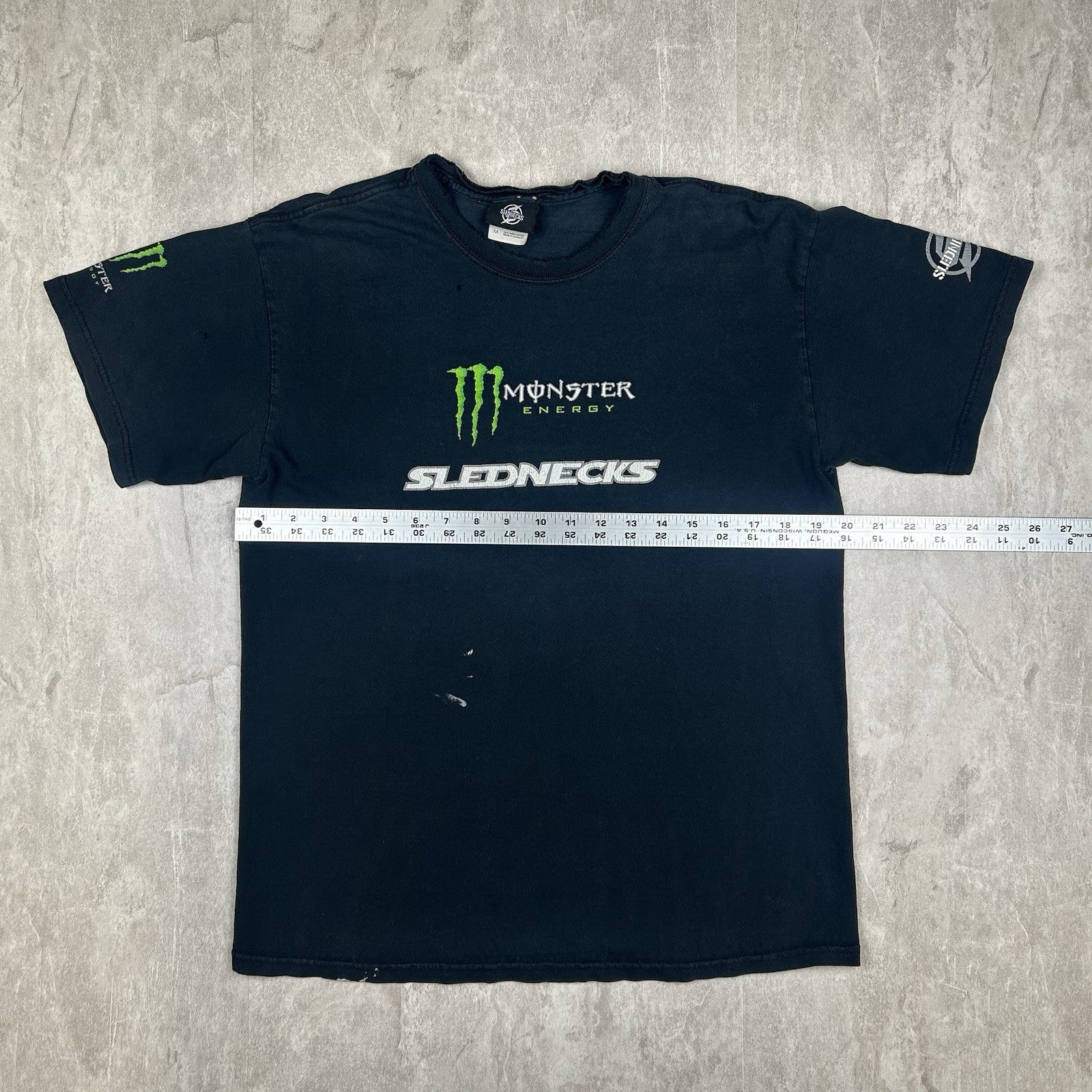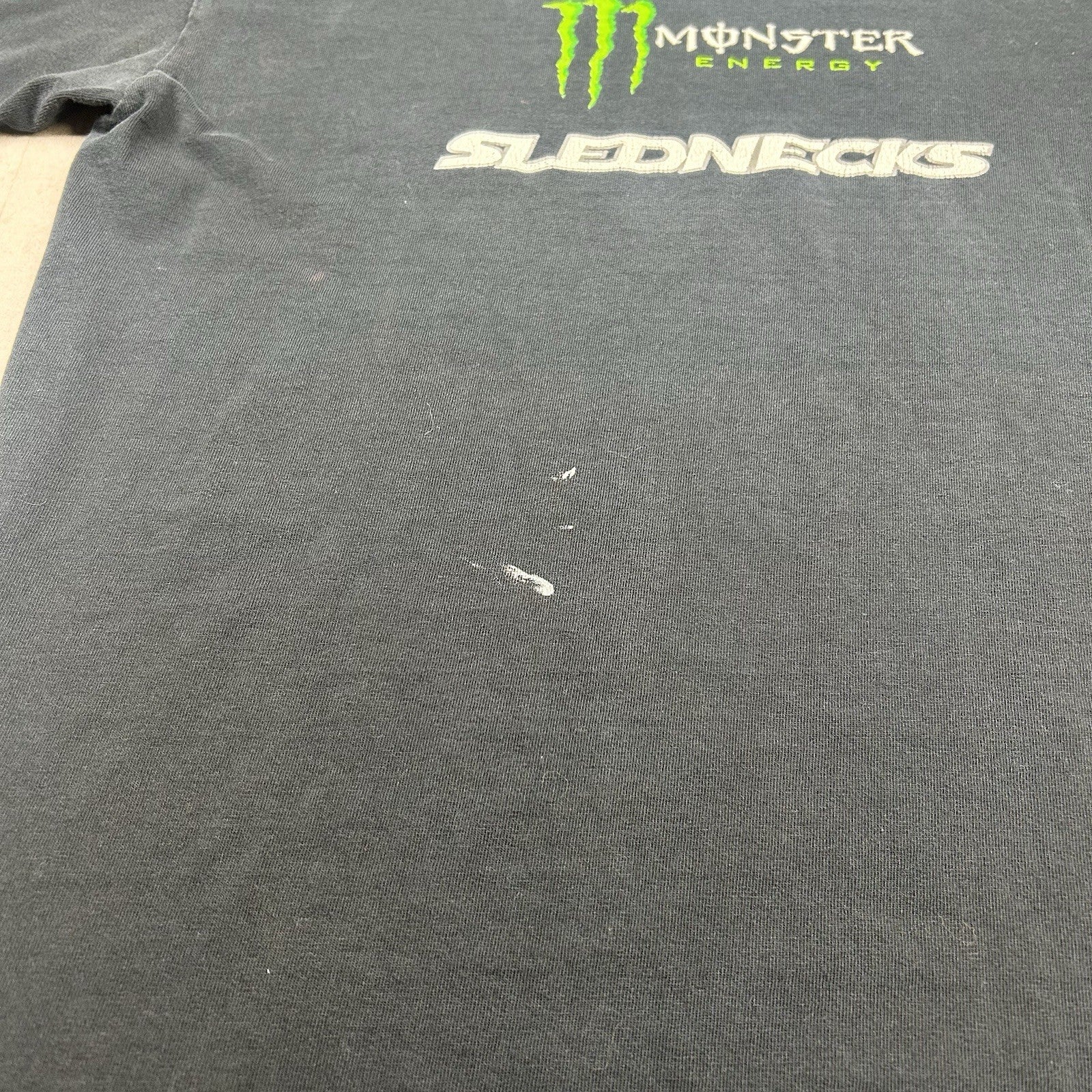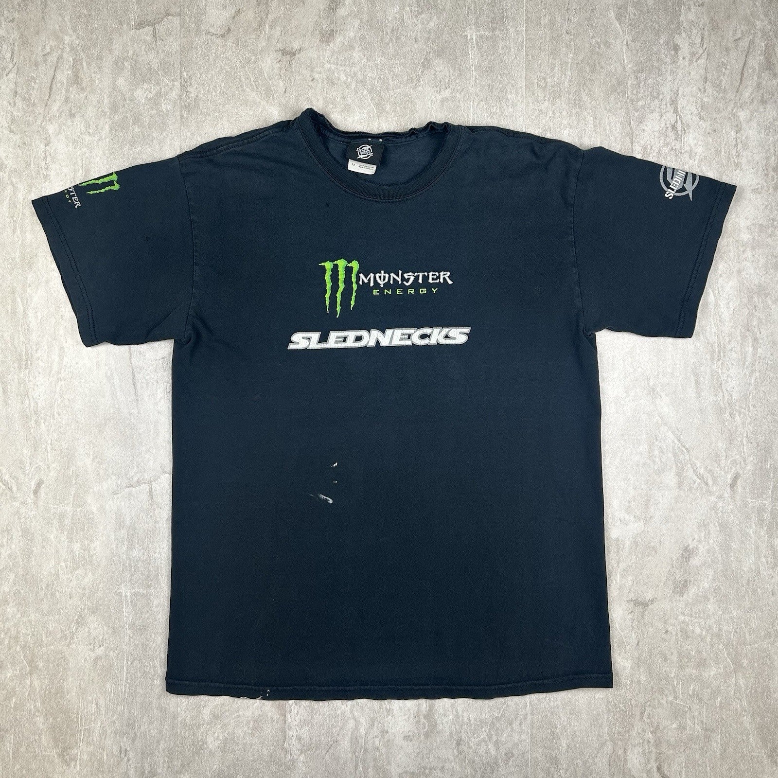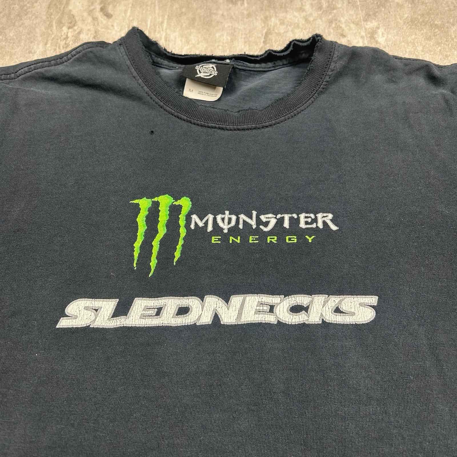 Vintage Y2K Slednecks T-shirt in black with bold Monster Energy graphics—an iconic nod to early 2000s snowmobile culture and extreme sports style. Men's size M.