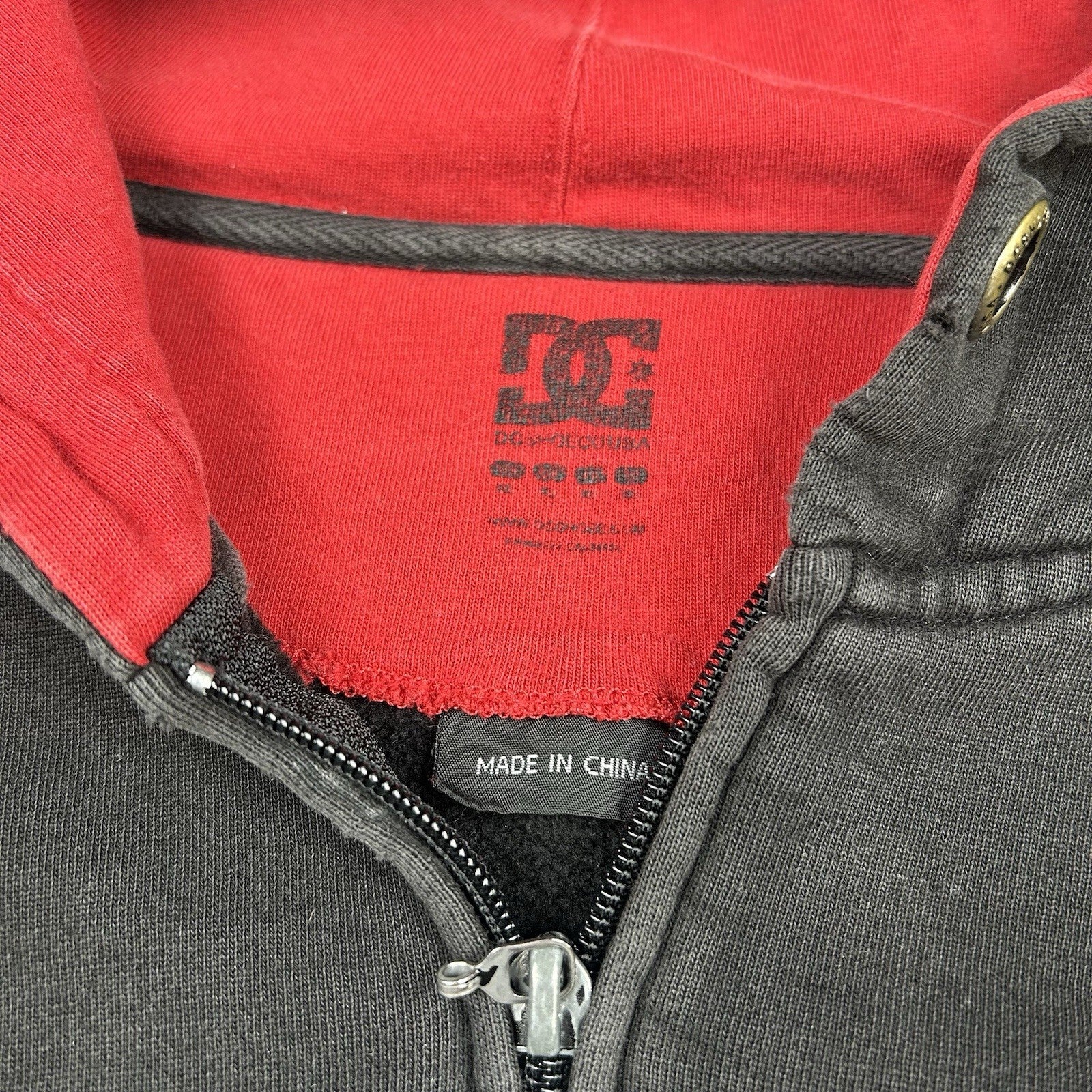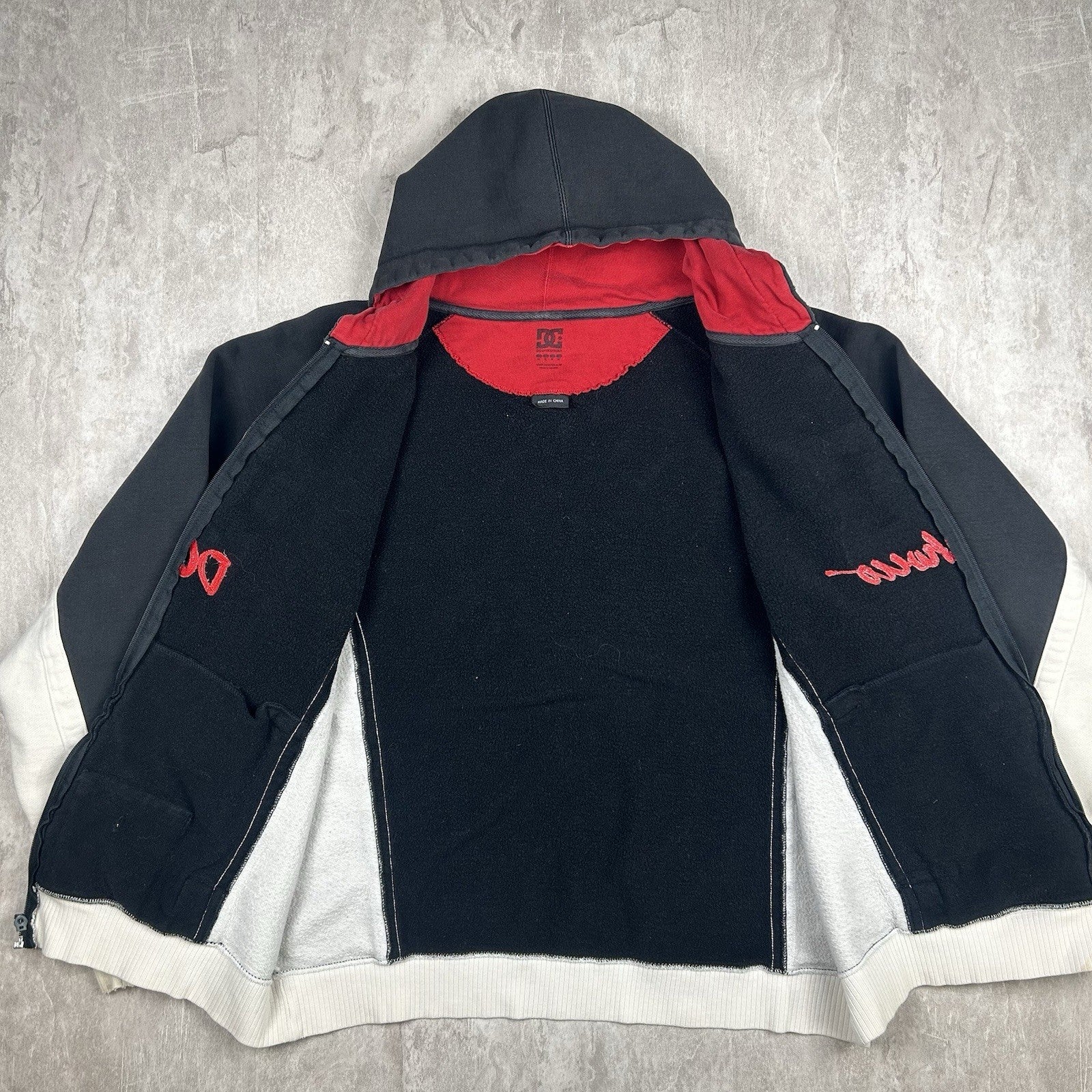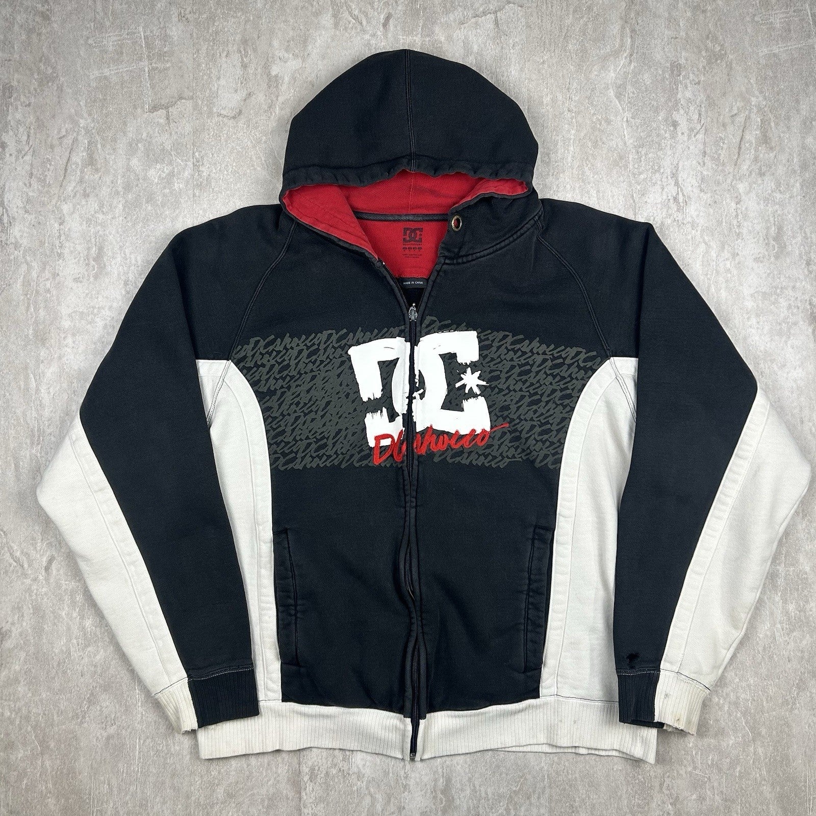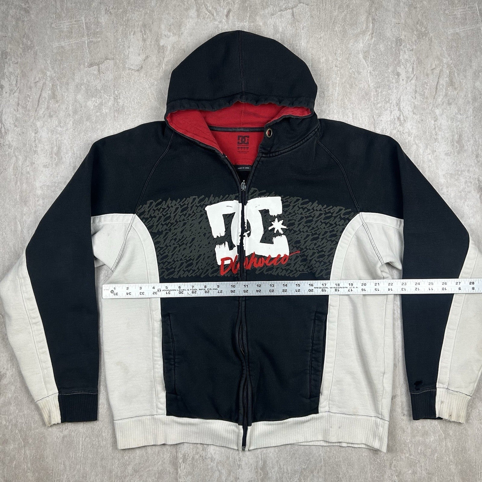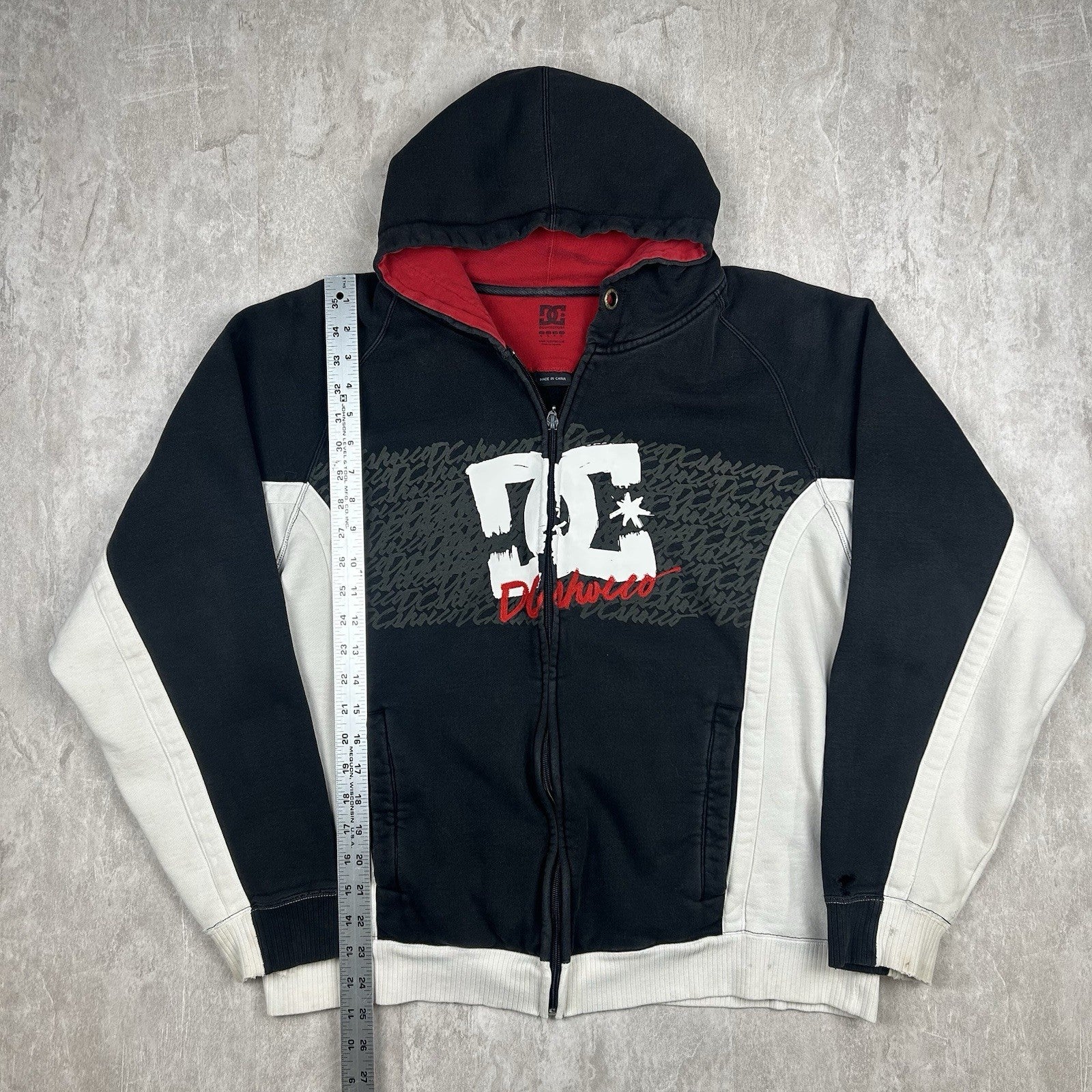 This vintage Y2K DC Shoes hoodie features a classic skate style with a bold black and red colorway, full zip closure, and signature branding. Men's size unknown.