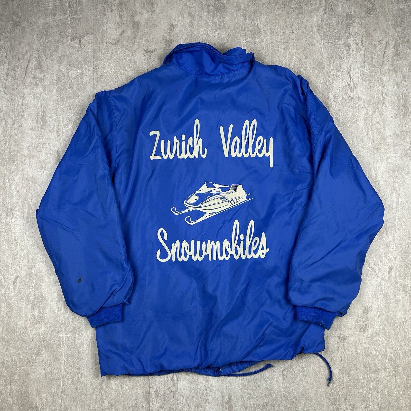 This vintage Zurich Valley Snowmobiles jacket is a Men's Size S in blue. Featuring a snap closure and classic snowmobile design, it's a stylish, retro piece by Aristo Jac Hilton.