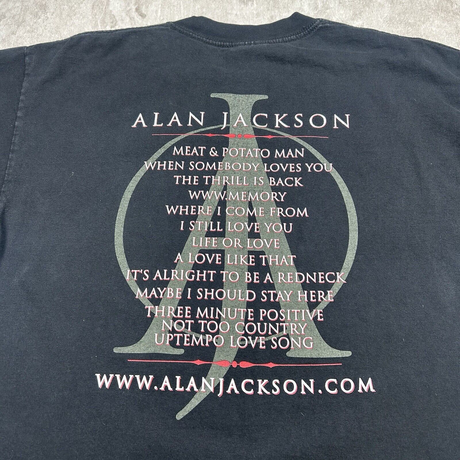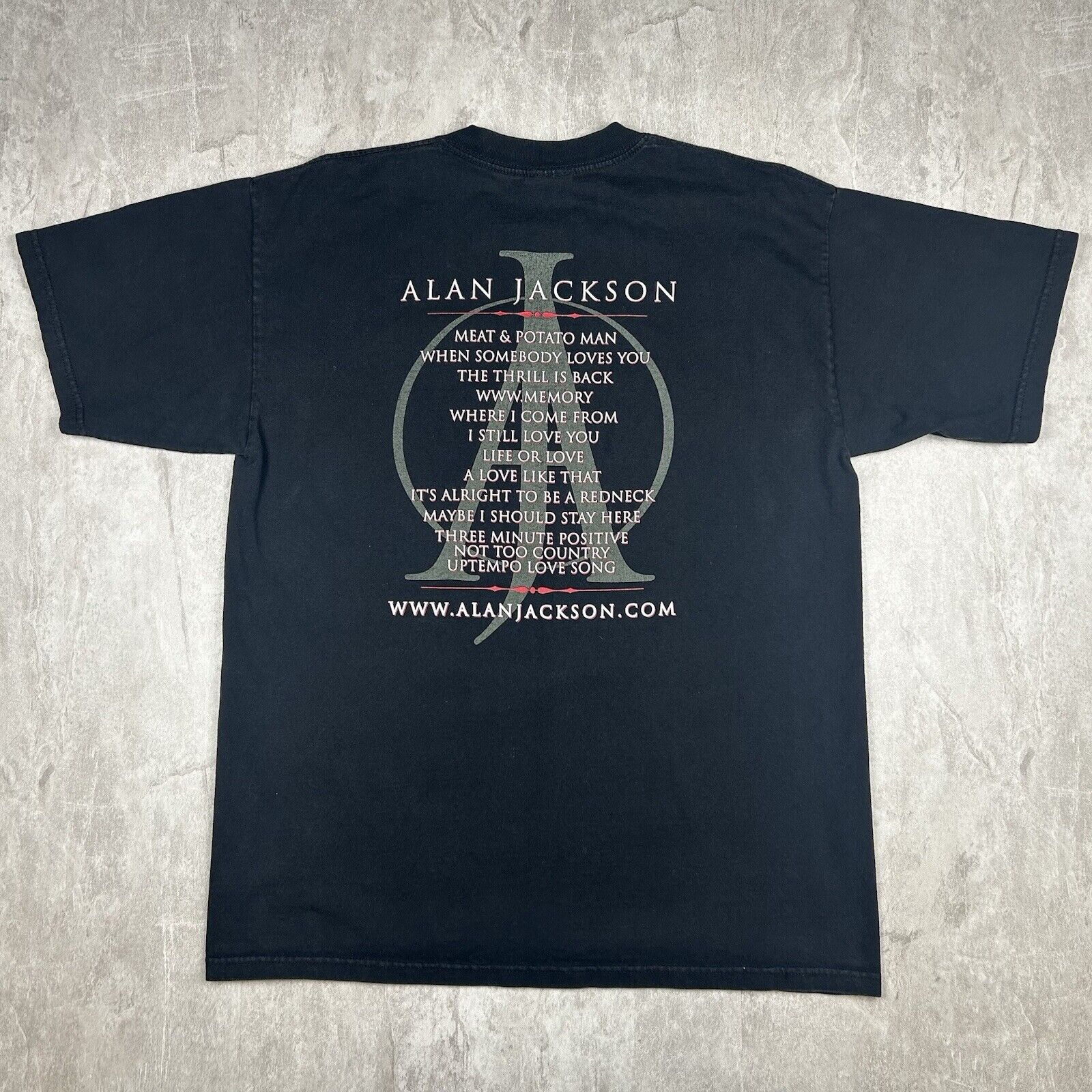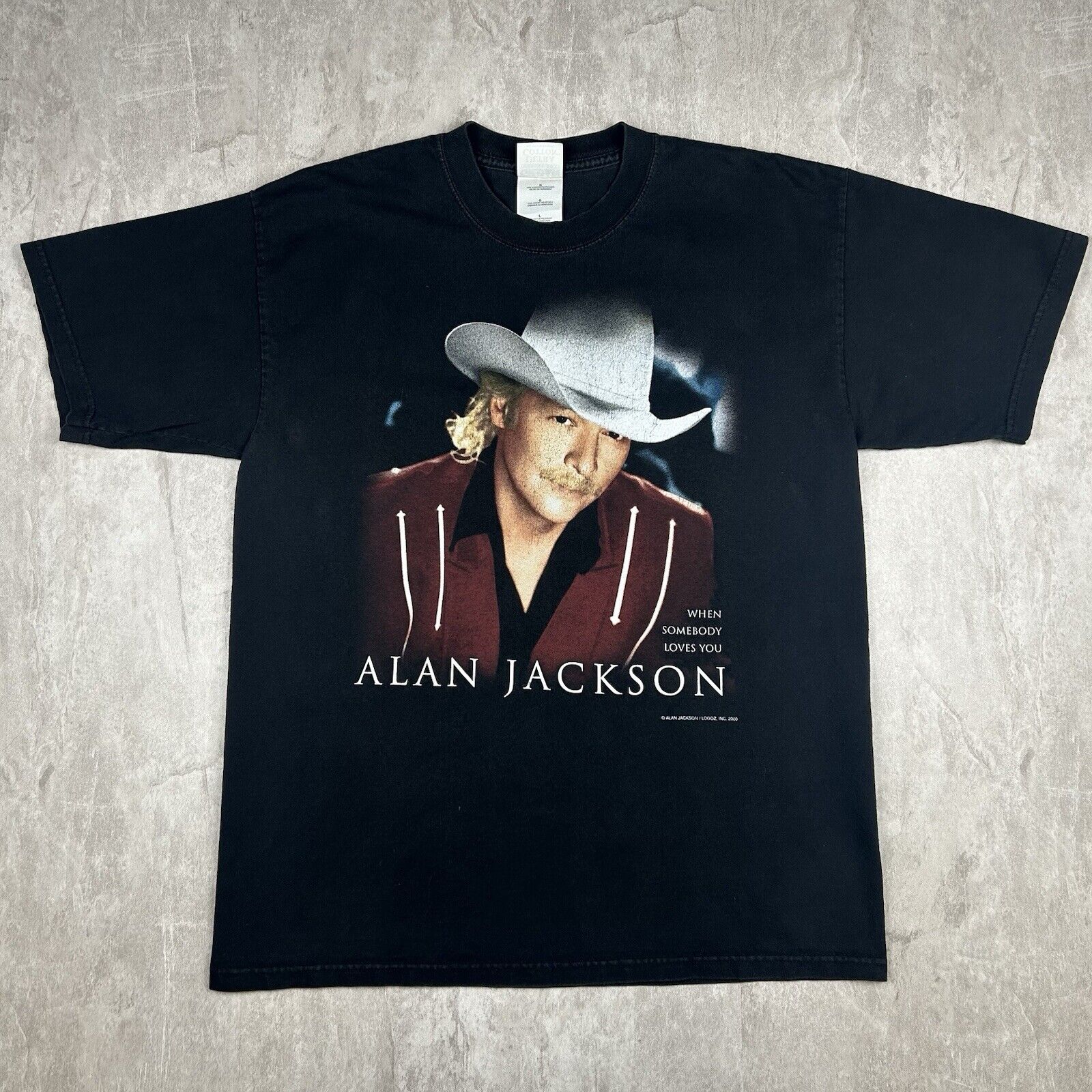 This vintage 2000 Alan Jackson tour T-shirt in Men's Size L celebrates the "When Somebody Loves You" tour with a classic black design and bold graphics. Perfect for fans of the country music legend, this tee brings back memories of Jackson's early 2000s hits. A must-have piece for collectors of country music memorabilia!
