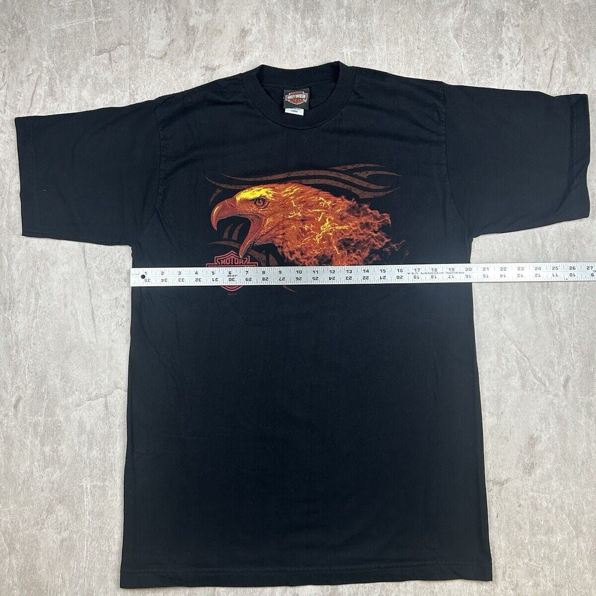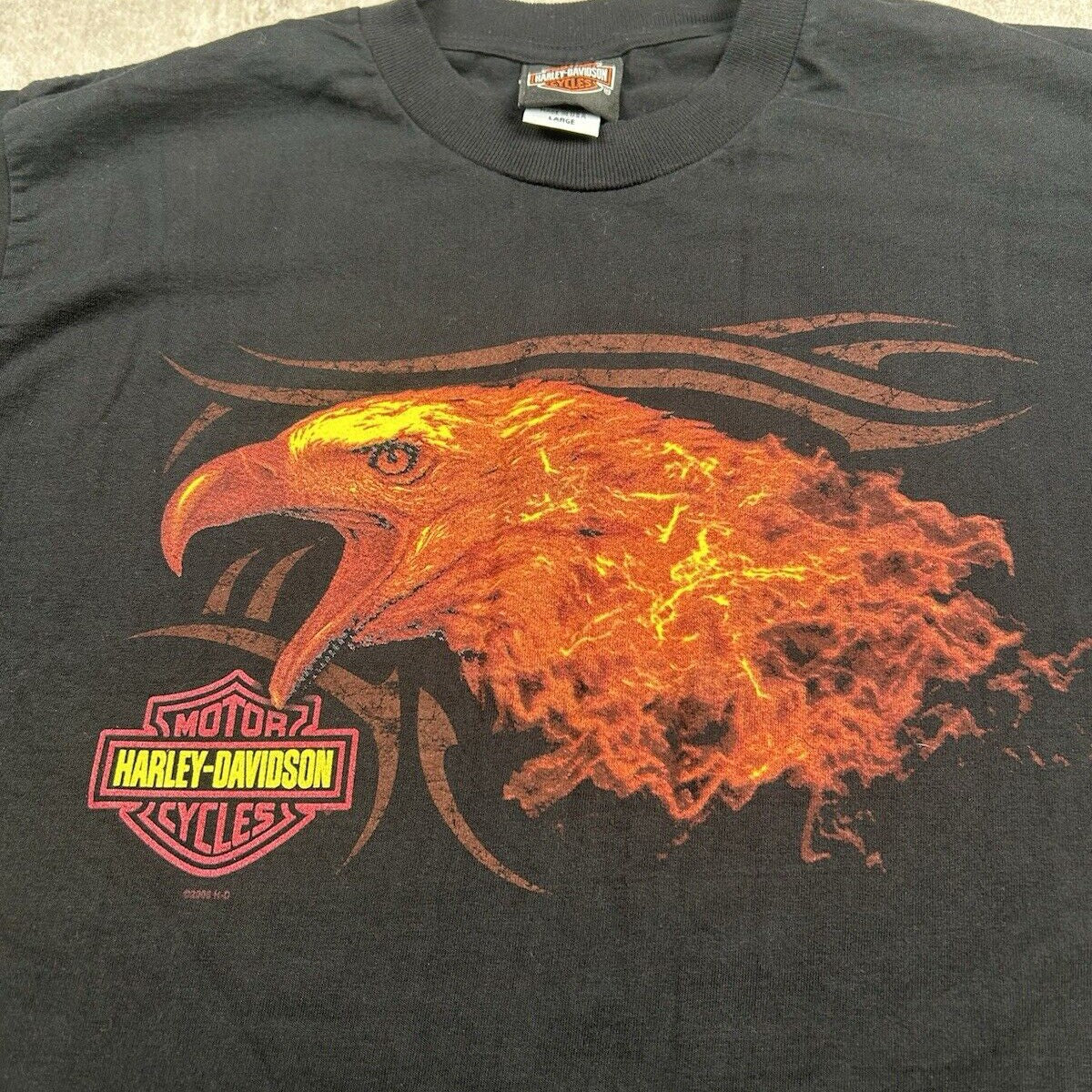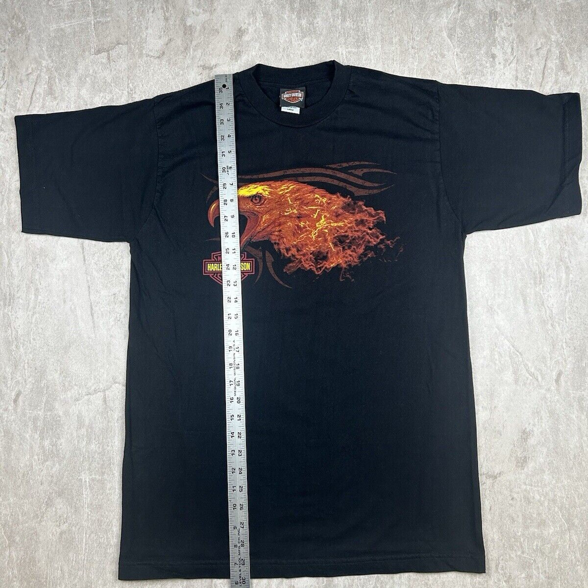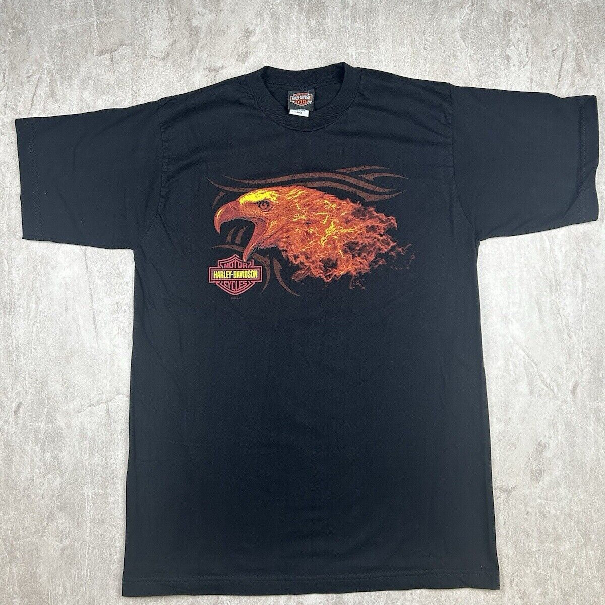 This vintage 2000s Harley Davidson T-shirt, sized for men in L, showcases a striking flaming eagle graphic, with a nod to Nassau, Bahamas. The shirt combines the iconic Harley Davidson brand with a bold design, making it a great find for collectors or fans of the brand.