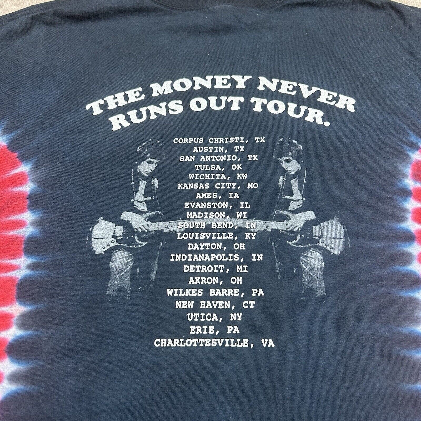 This vintage 2003 Bob Dylan Money Never Runs Out tour T-shirt in Men's Size XL features bold red and blue graphics, celebrating Dylan's iconic tour. Made from soft cotton, this tee offers a comfortable fit and timeless appeal. A must-have for fans of Bob Dylan and collectors of vintage music apparel!