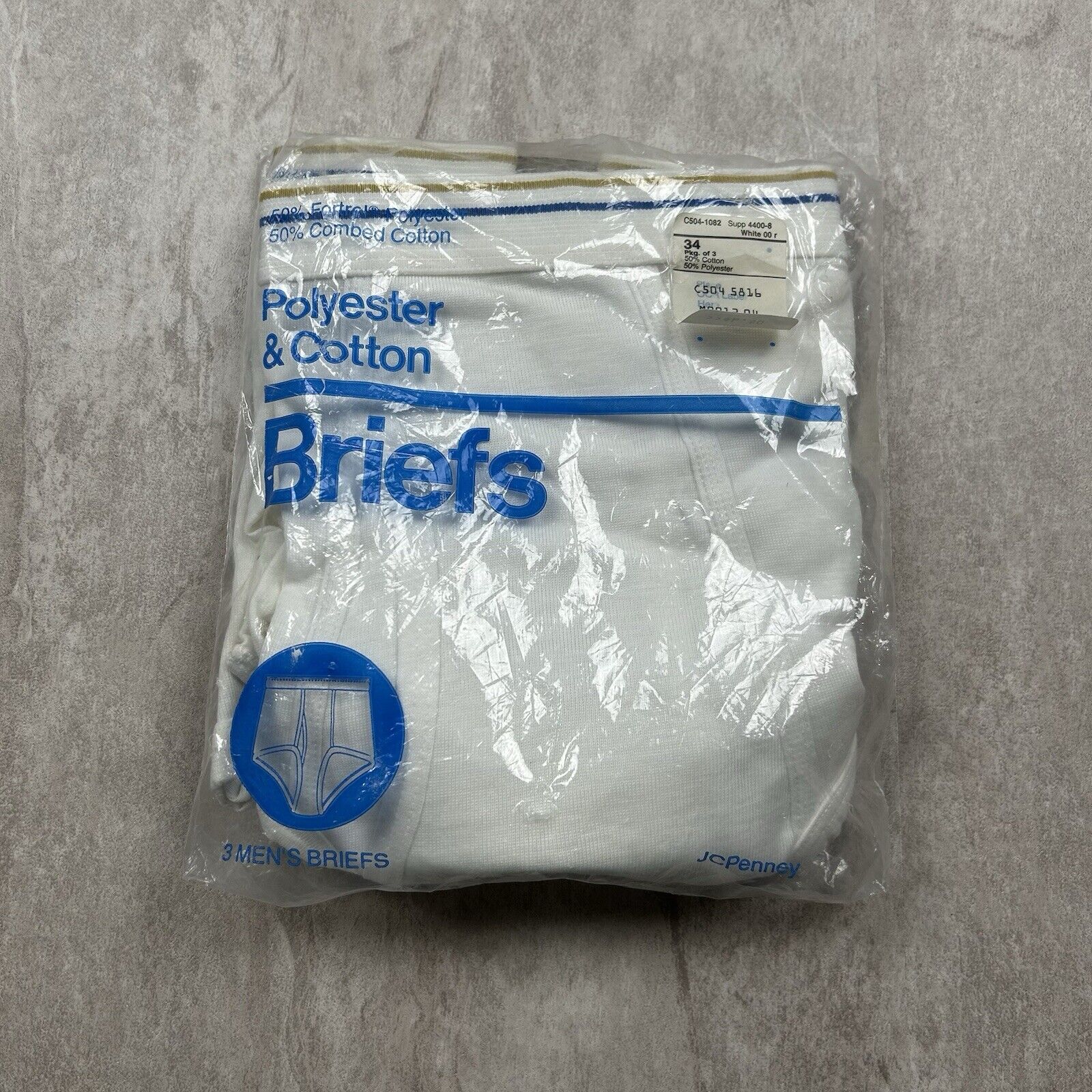 This Vintage 3-Pack of Towncraft Underwear from JCPenney features classic white poly/cotton briefs in men's size 34. Made in the USA, these unworn vintage essentials are perfect for collectors of retro apparel or those seeking timeless undergarment styles.