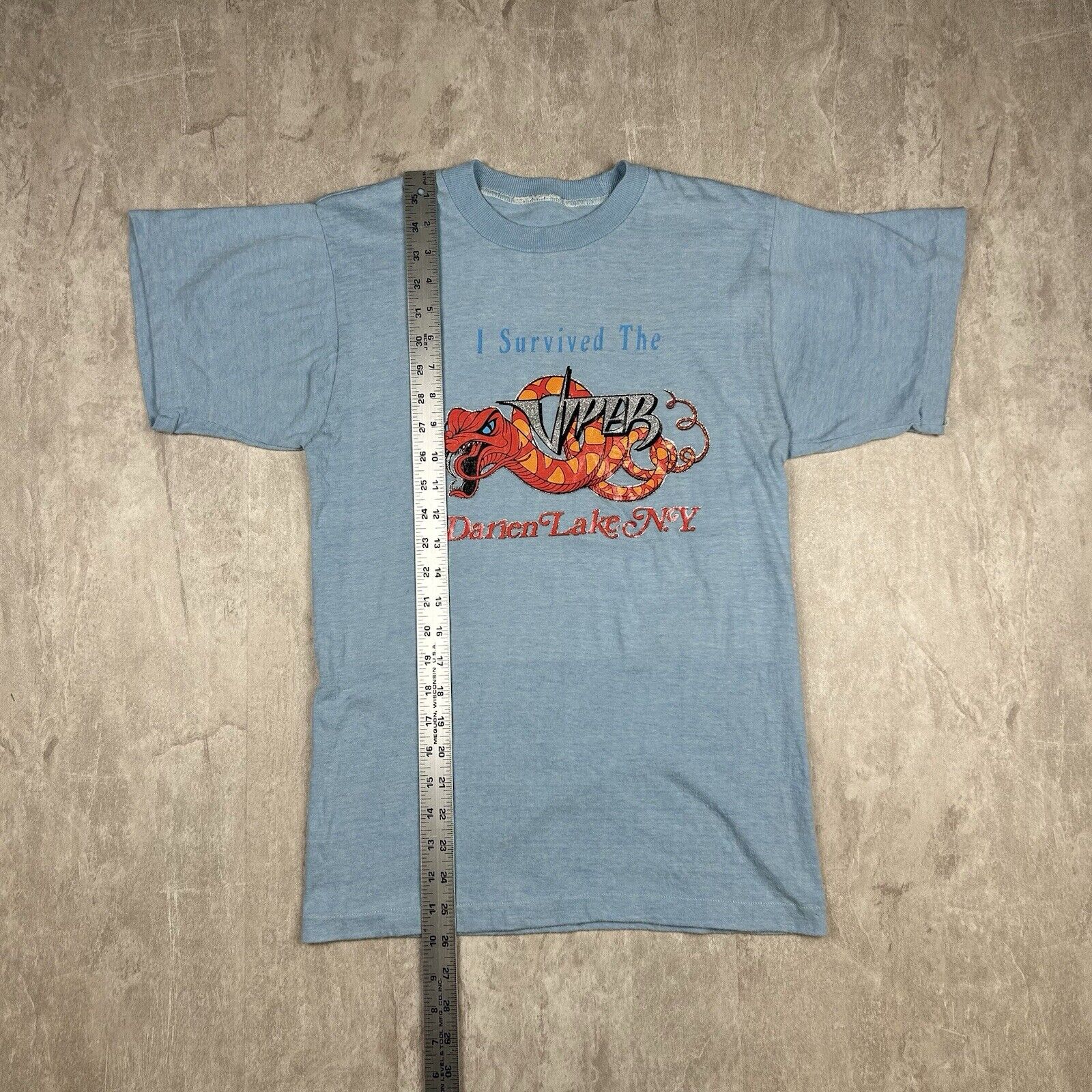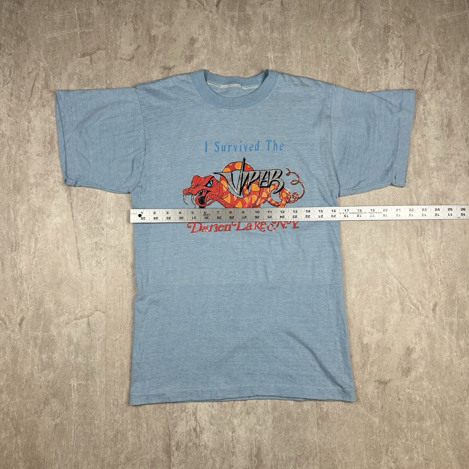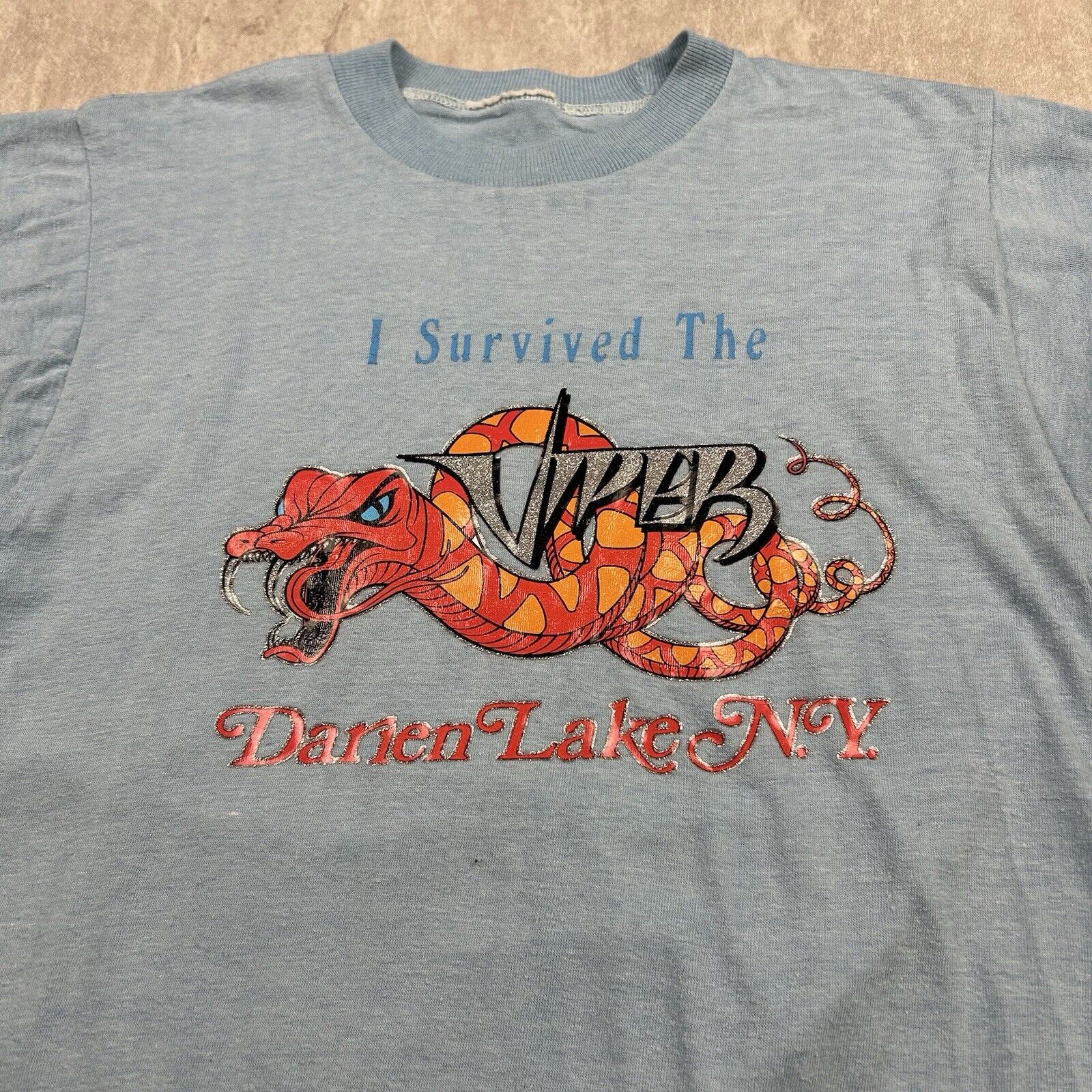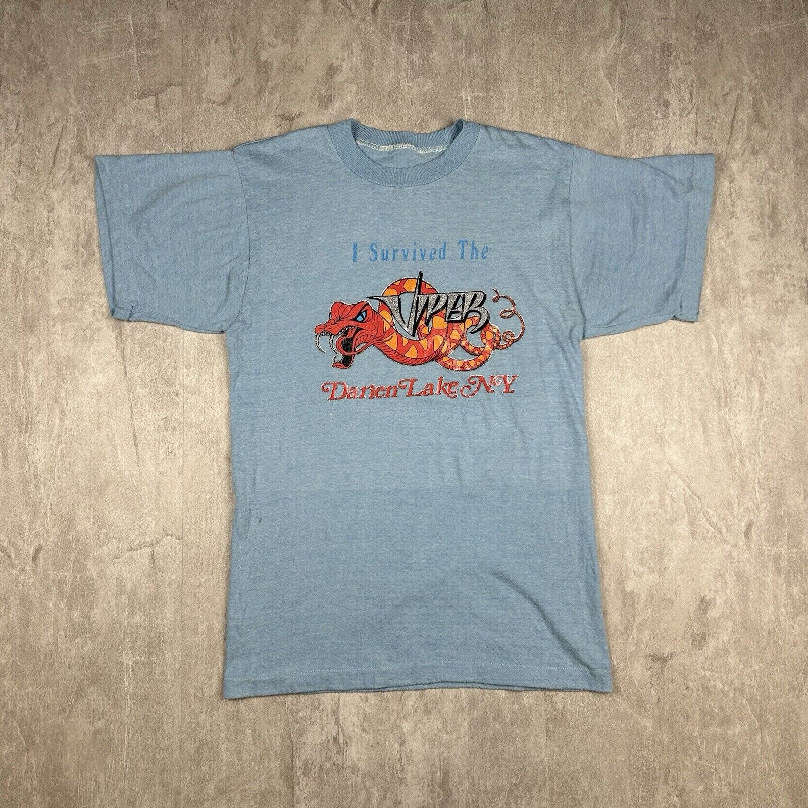 Relive the thrills with this Vintage 90s Darien Lake 'I Survived The Viper' T-Shirt. Featuring a bold graphic celebrating the iconic roller coaster, this tee is perfect for amusement park enthusiasts. Though the men's size is unknown, it's a nostalgic piece for anyone who braved the Viper's legendary twists and turns.