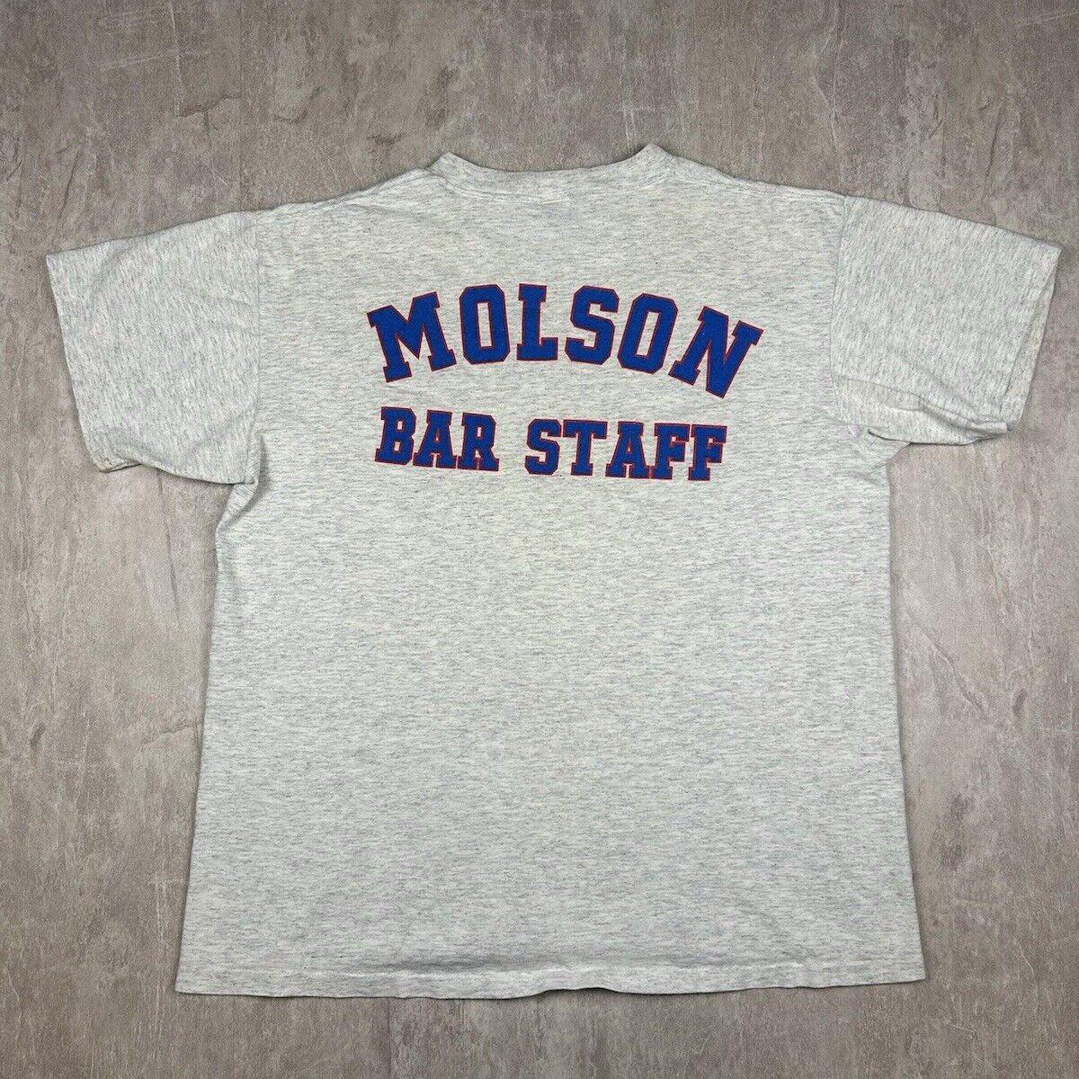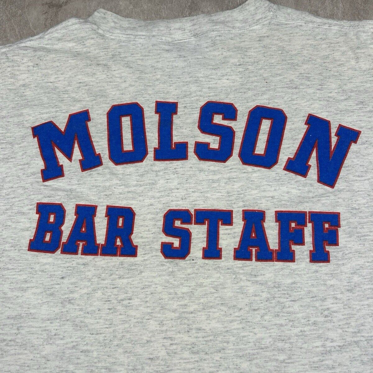 Vintage 1990s Molson Canadian Beer T-shirt by Oneita. This gray tee features a "Bar Staff" graphic, celebrating the iconic beer brand. Made from soft, durable fabric, it was originally worn by bar staff and carries a unique vintage appeal. Men's size L.