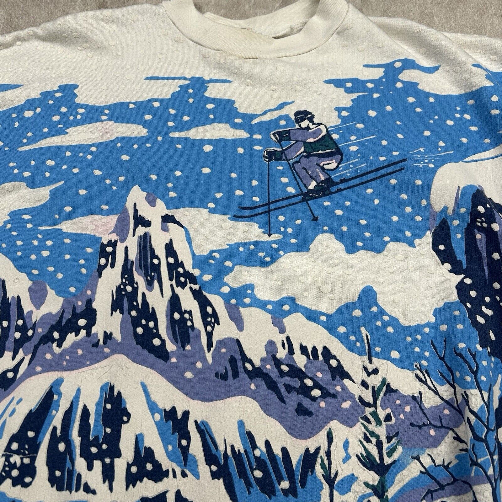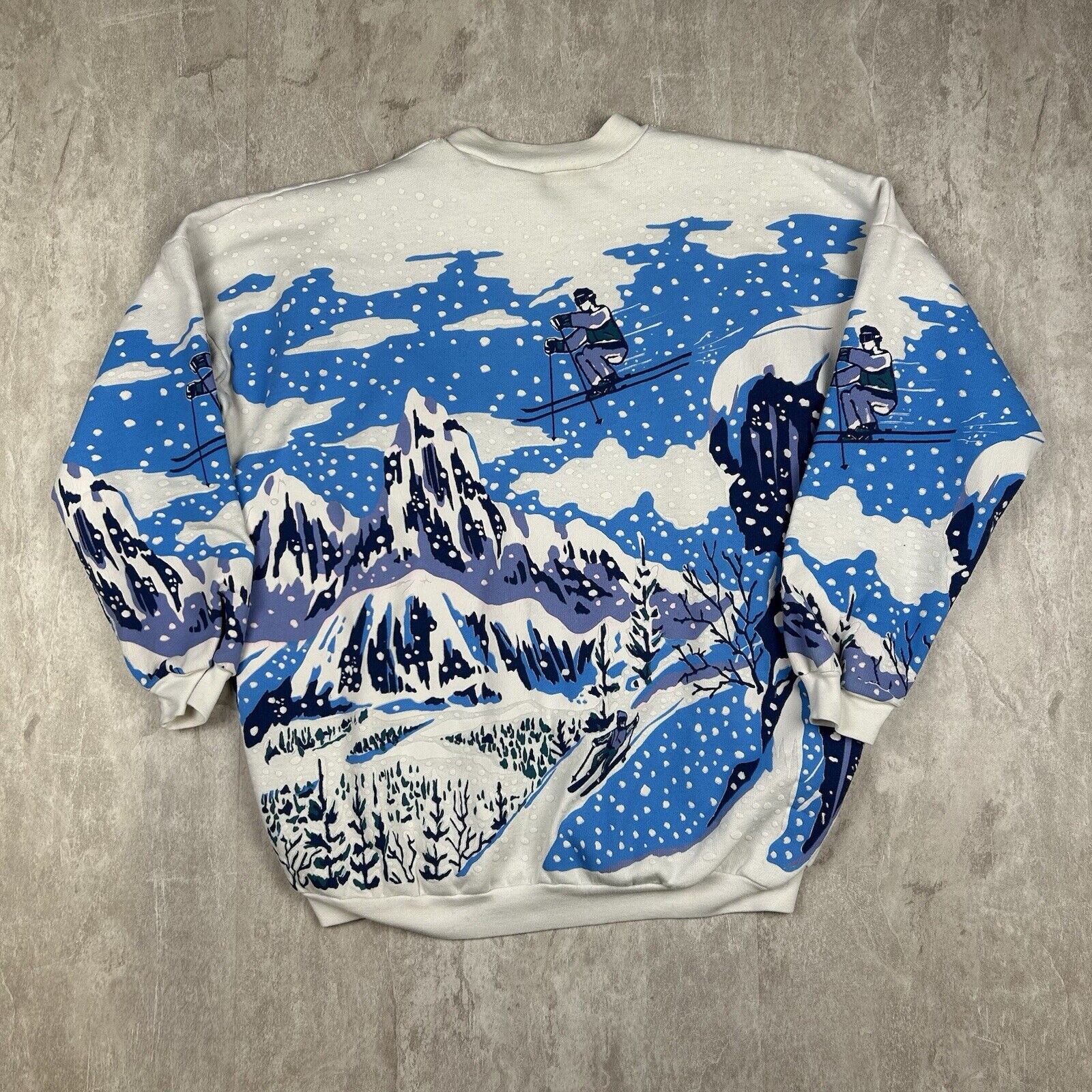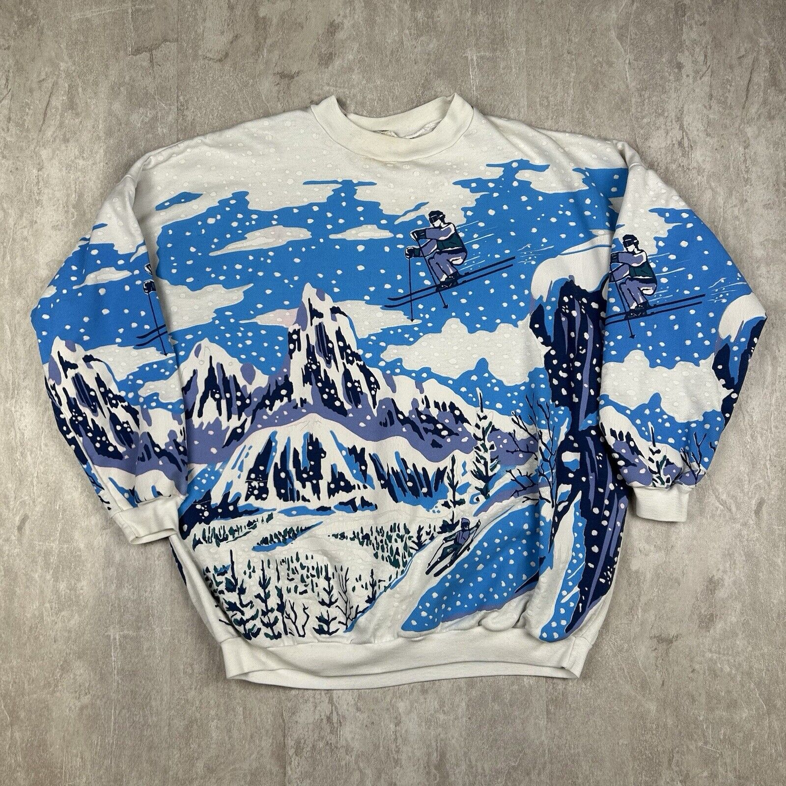 This Vintage 90s Snow Mountain All-Over Print Crewneck Sweatshirt in women's petite-small features a striking artistic ski-inspired design. With grunge aesthetics, it's perfect for fans of retro winter fashion and unique vintage apparel.