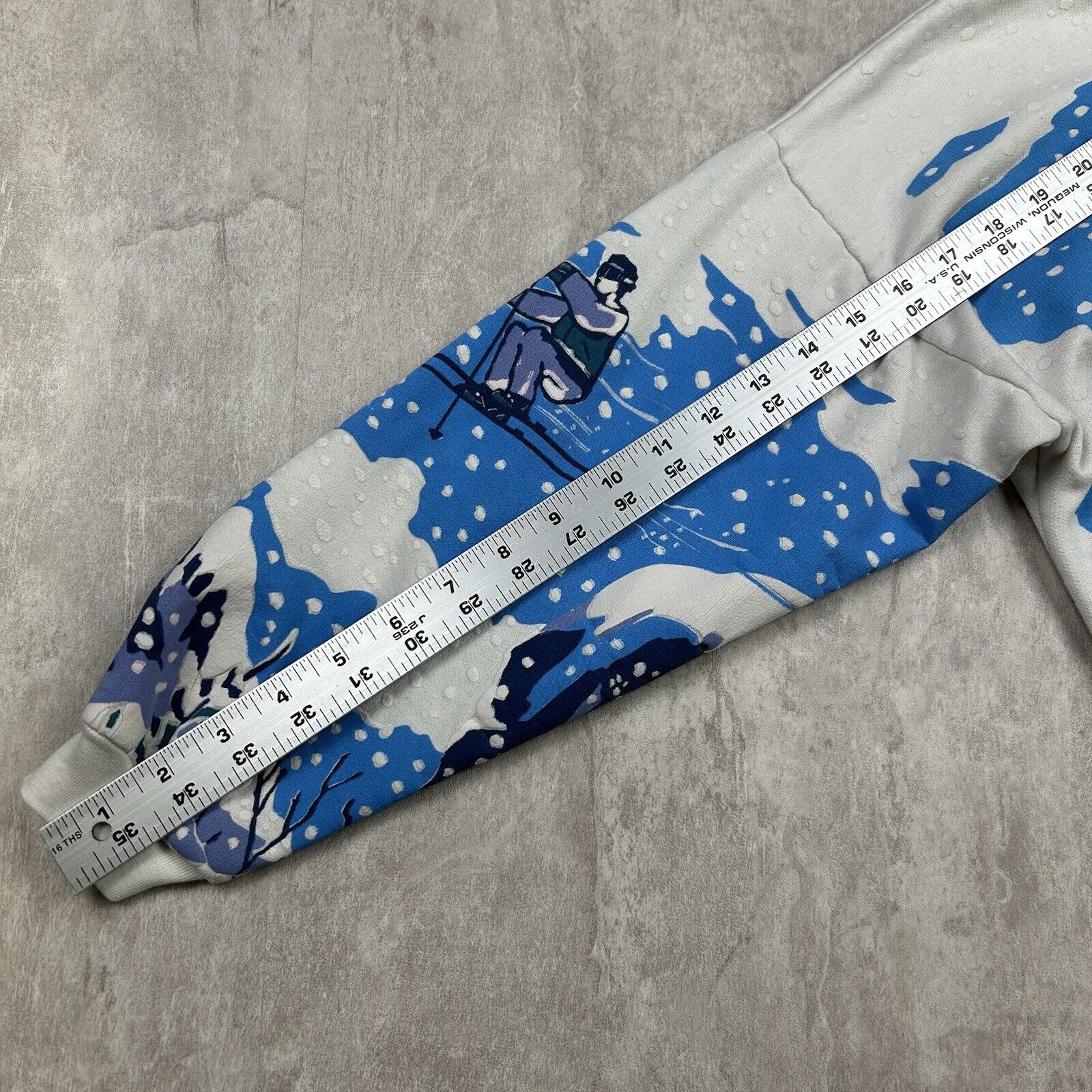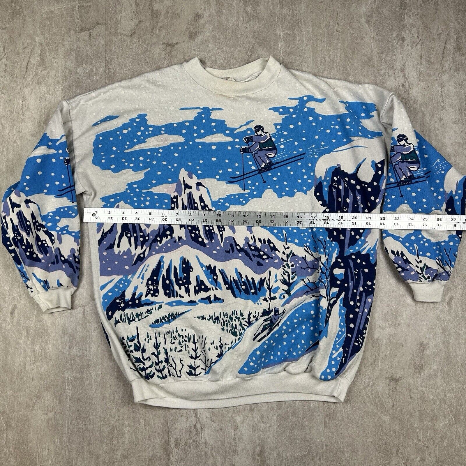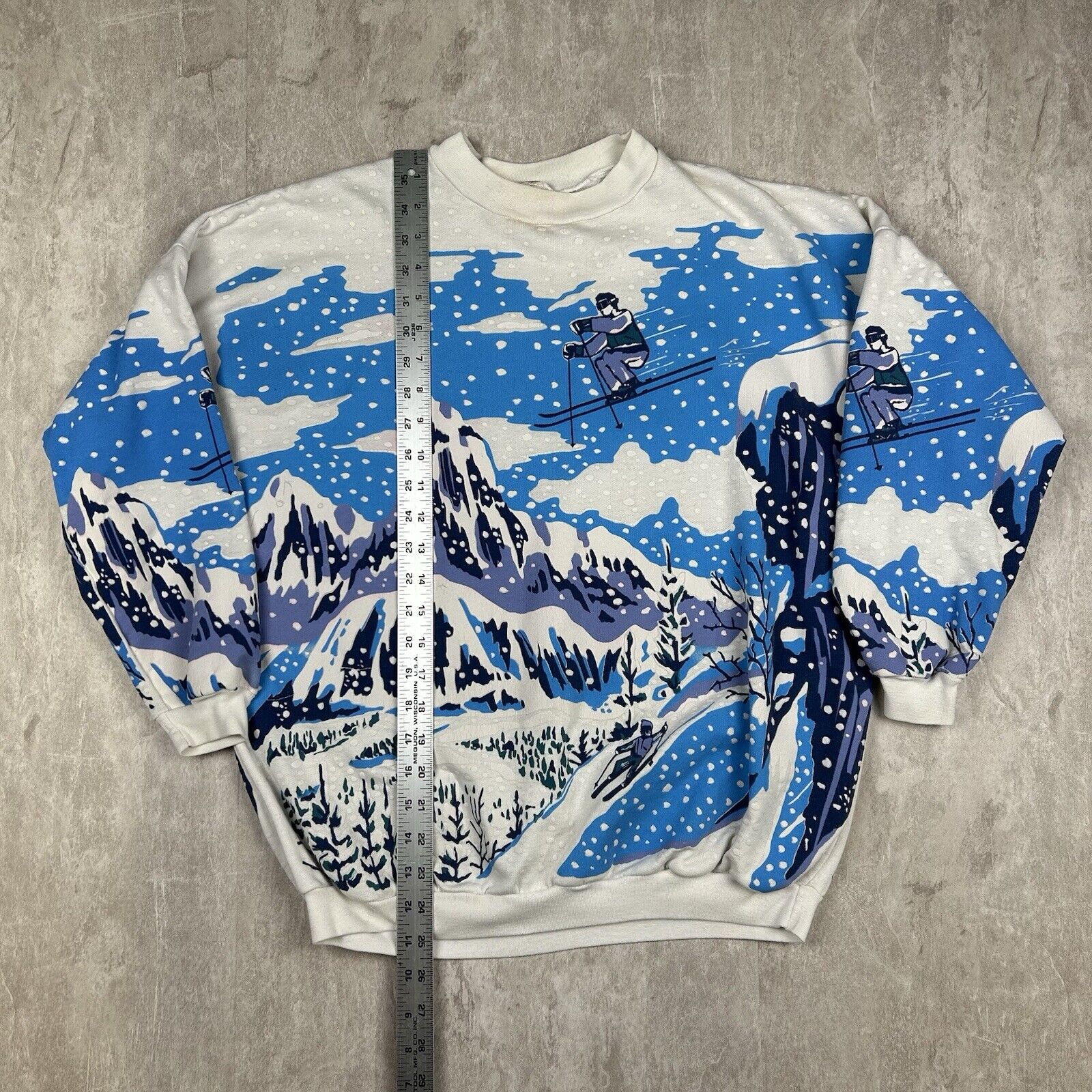 This Vintage 90s Snow Mountain All-Over Print Crewneck Sweatshirt in women's petite-small features a striking artistic ski-inspired design. With grunge aesthetics, it's perfect for fans of retro winter fashion and unique vintage apparel.