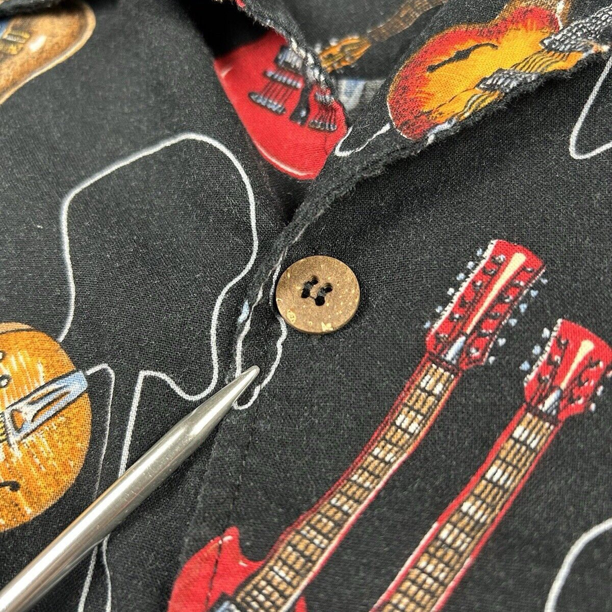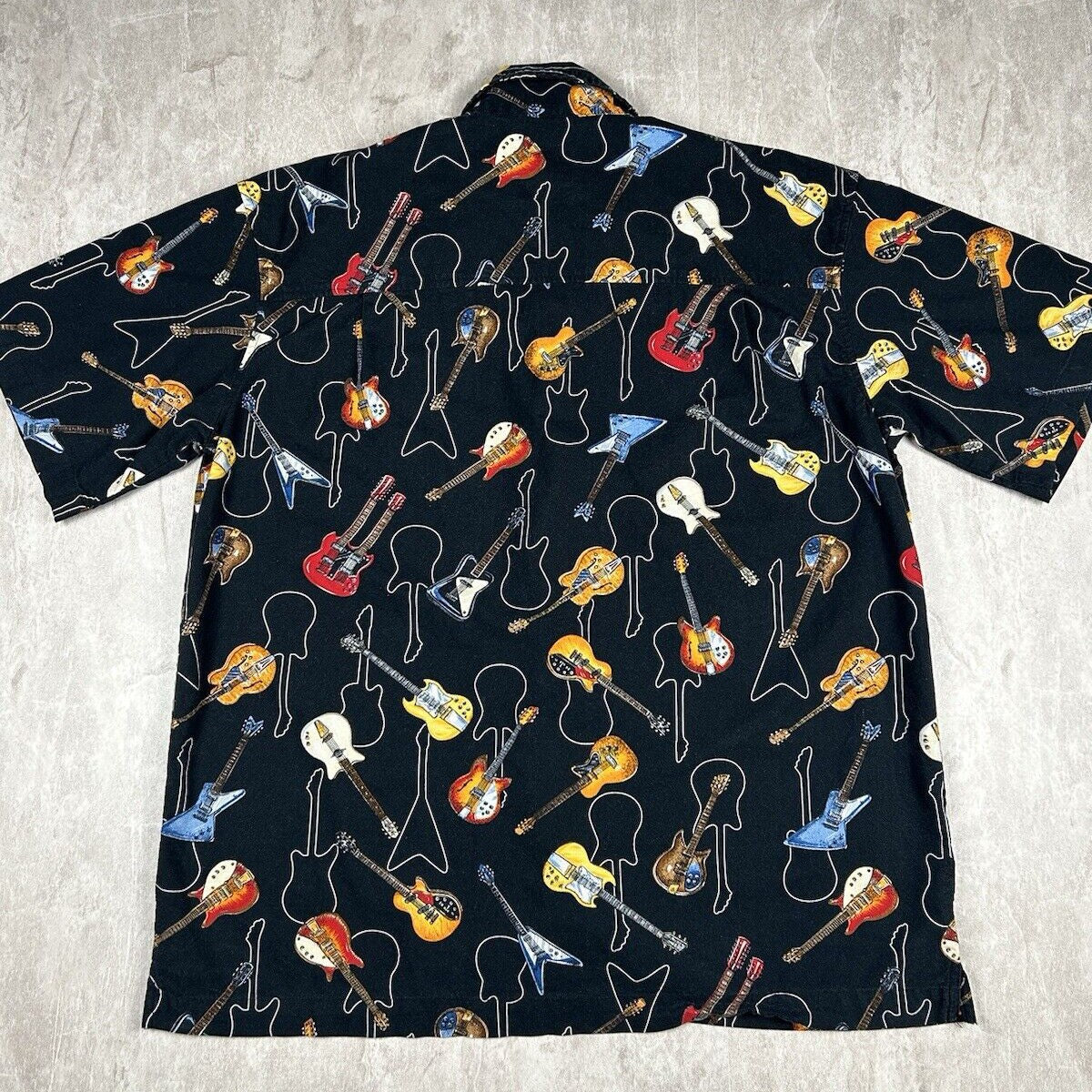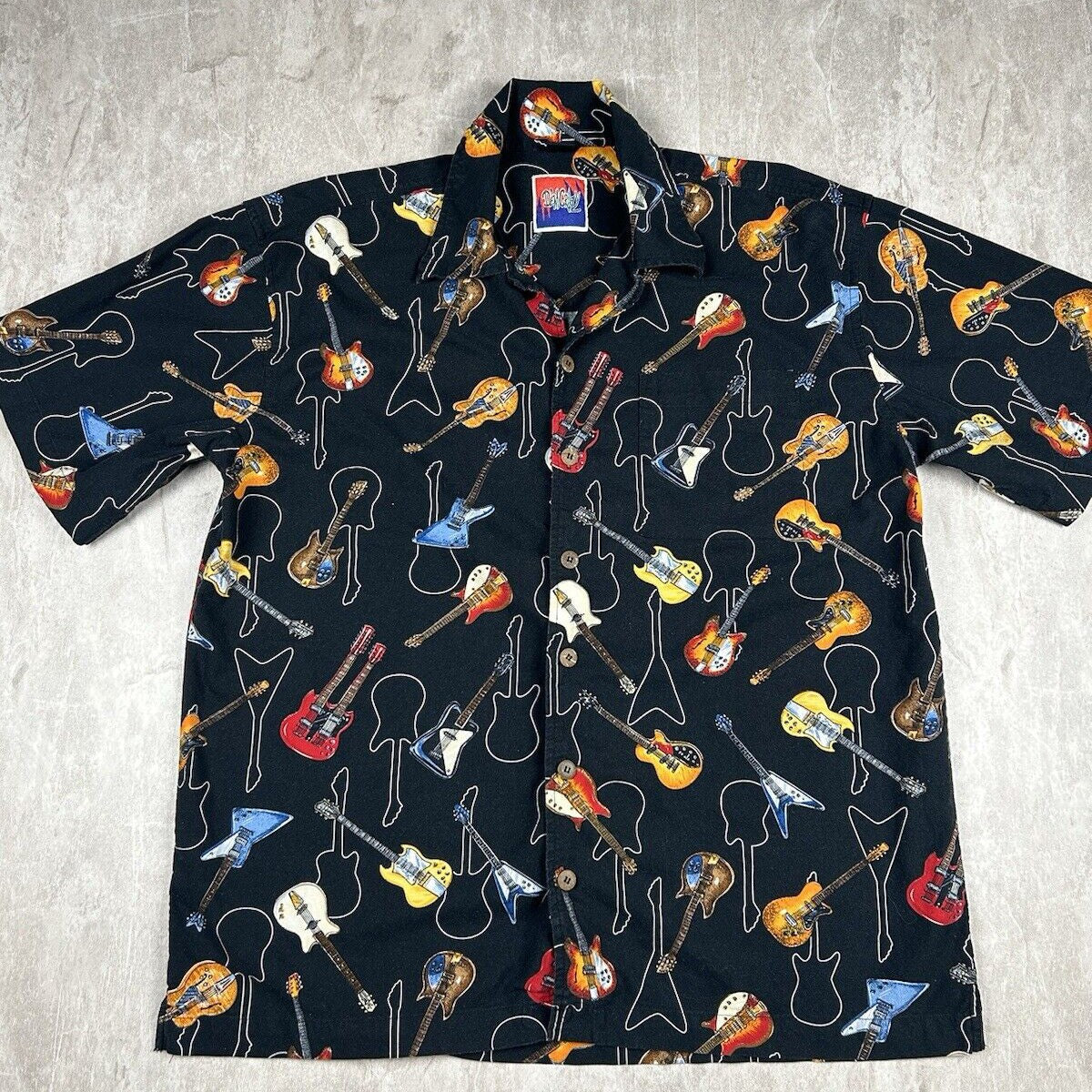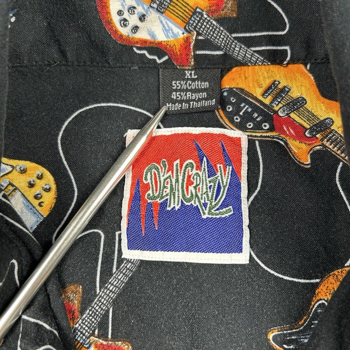 Vtg Dem Crazy Shirt Guitar All Over Print Button Up Short Sleeve Men’s Size XL