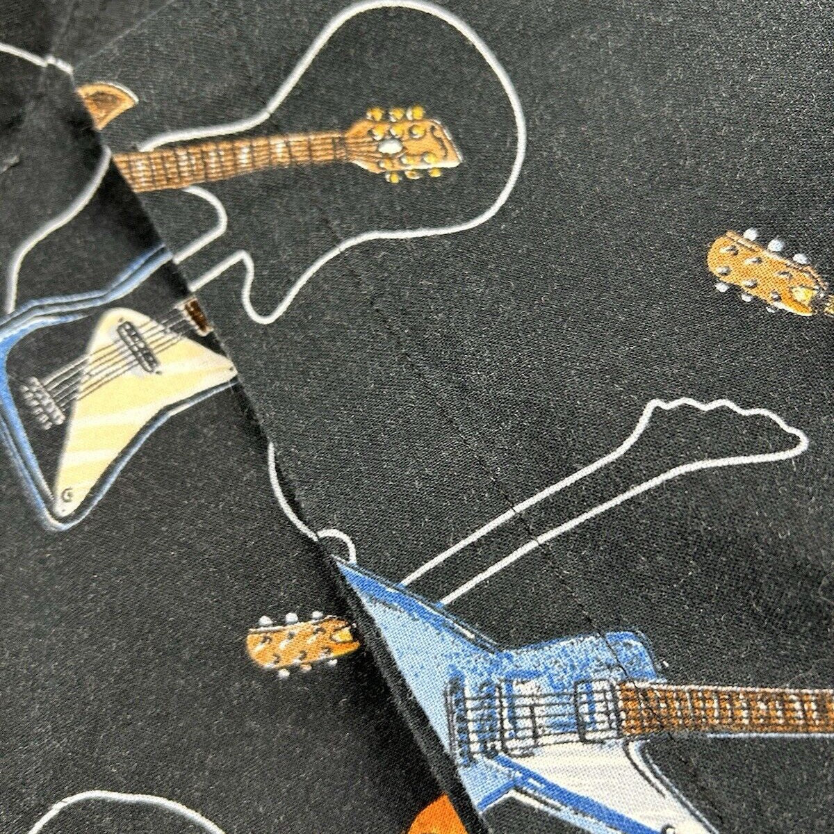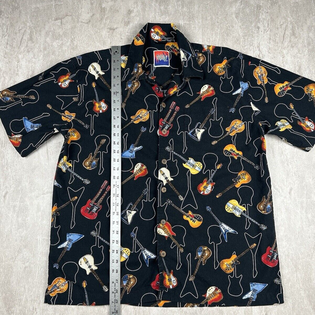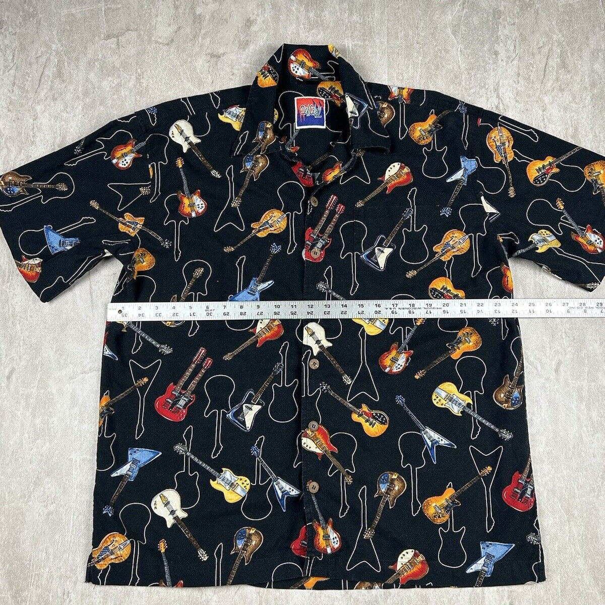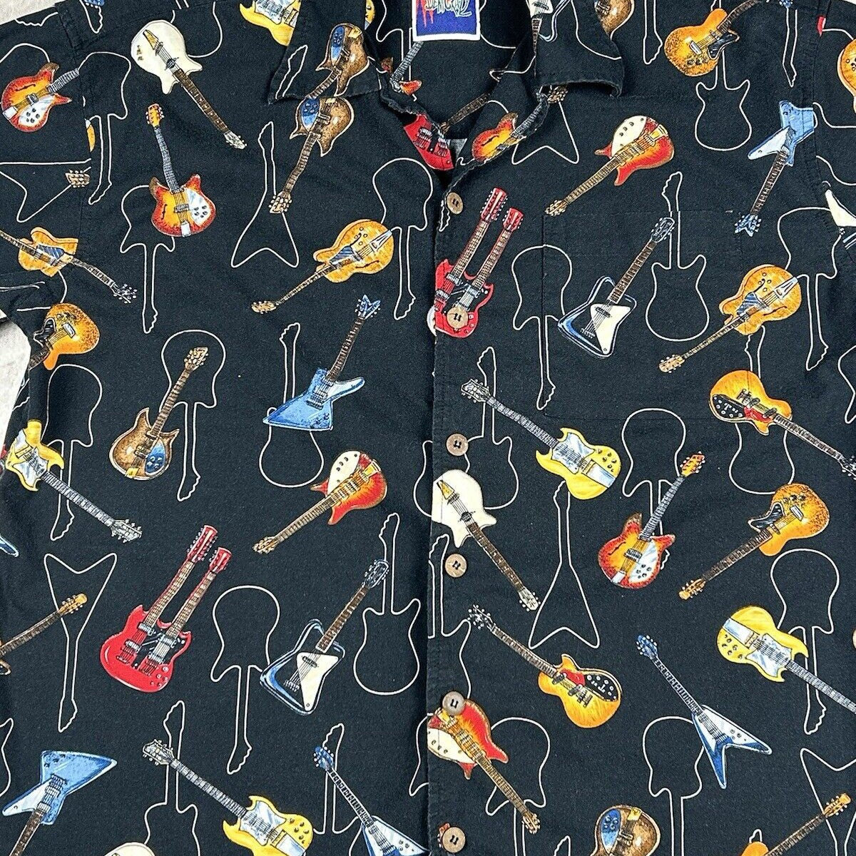 Vtg Dem Crazy Shirt Guitar All Over Print Button Up Short Sleeve Men’s Size XL