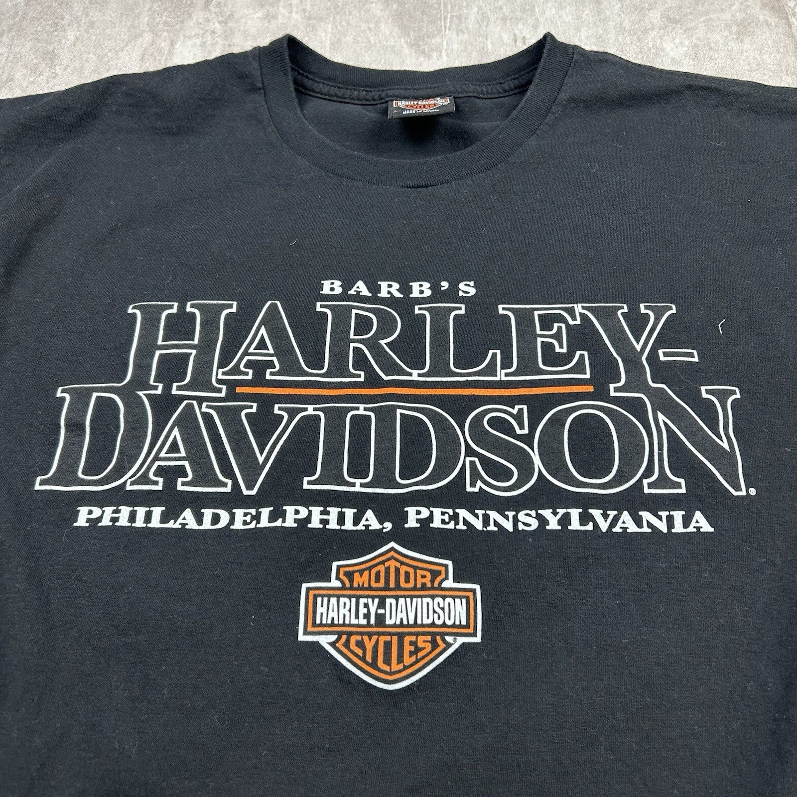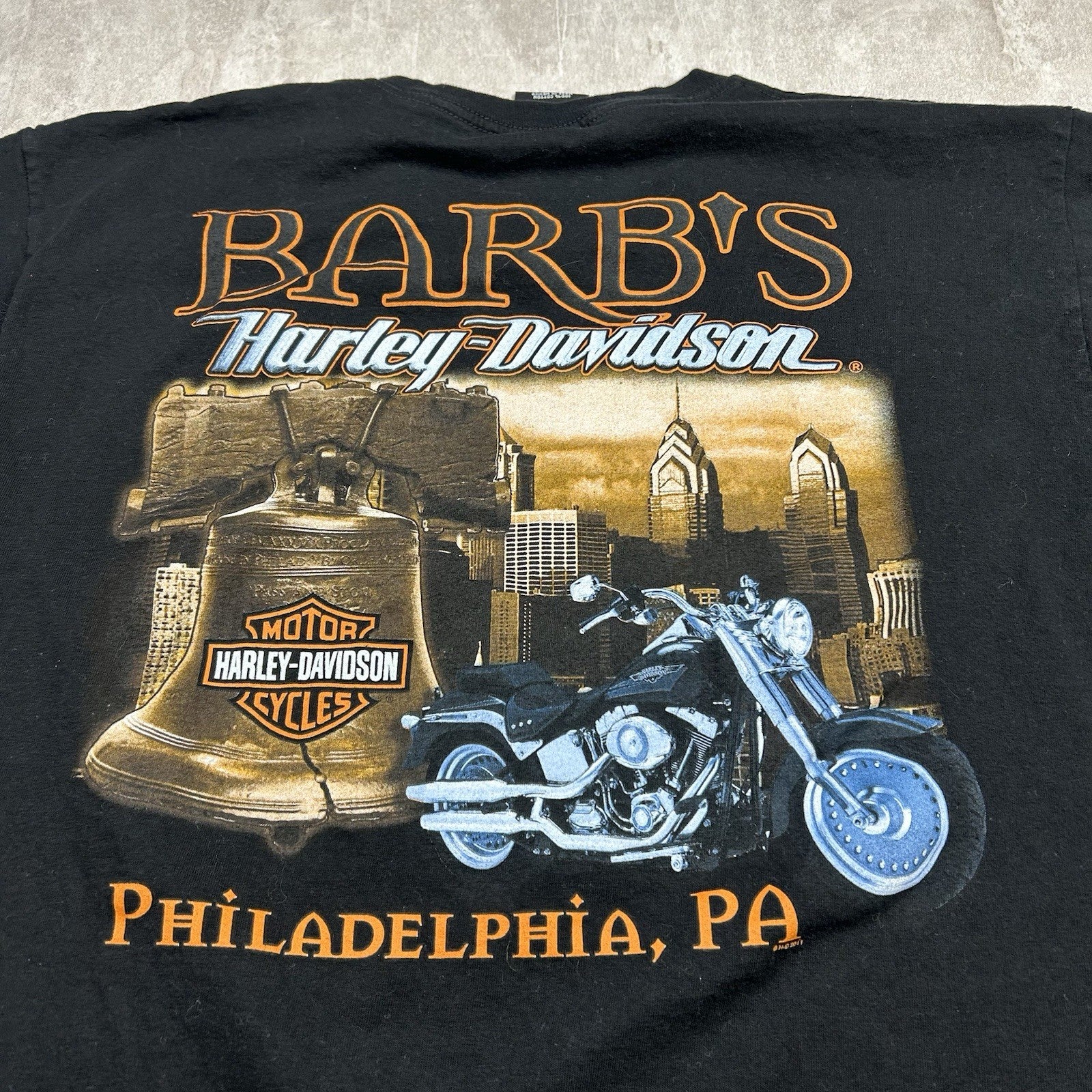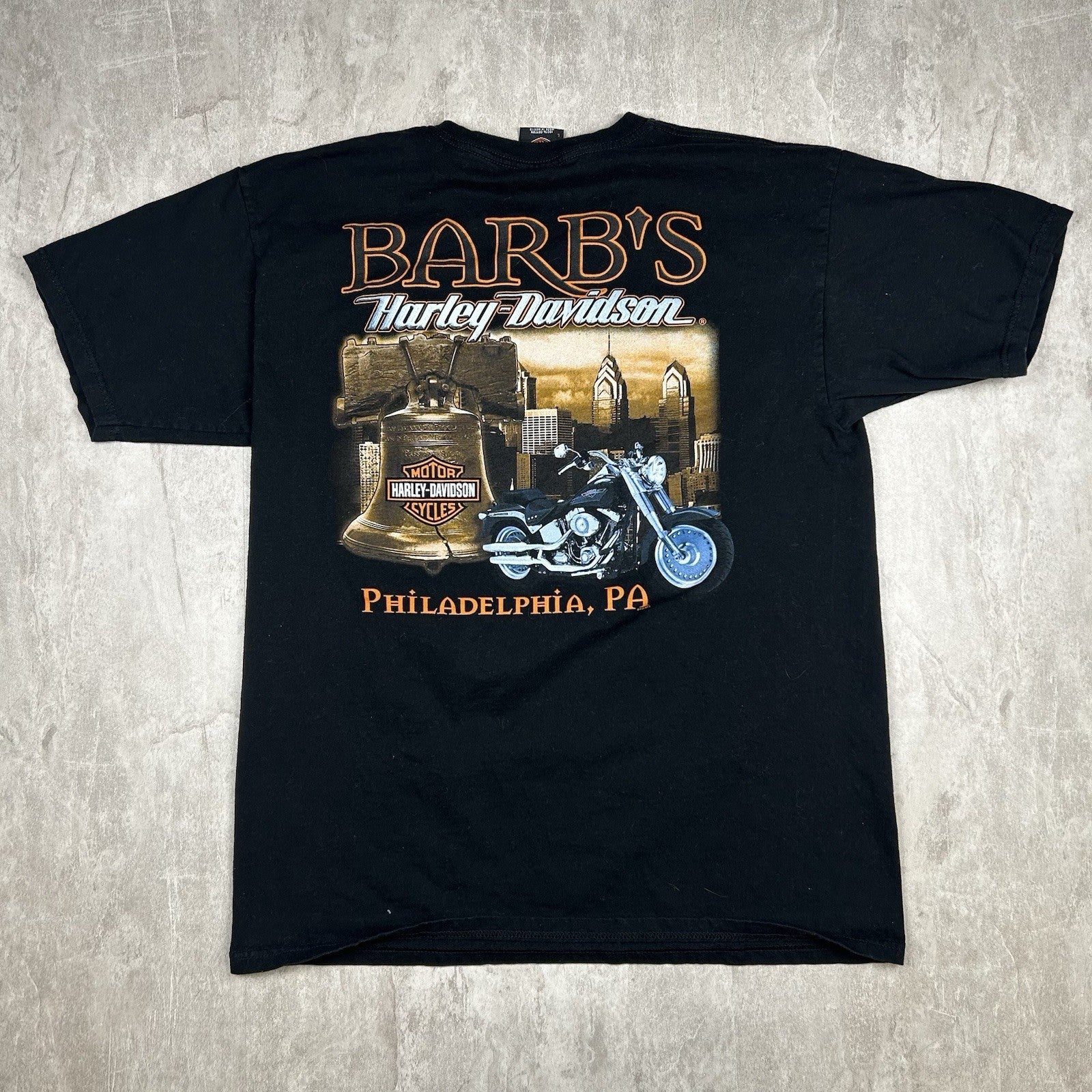 This vintage Harley-Davidson T-shirt features bold graphics from Barb's Harley in Philadelphia. Classic black design with iconic front and back prints. A great piece for collectors and riders alike. Men's size L.