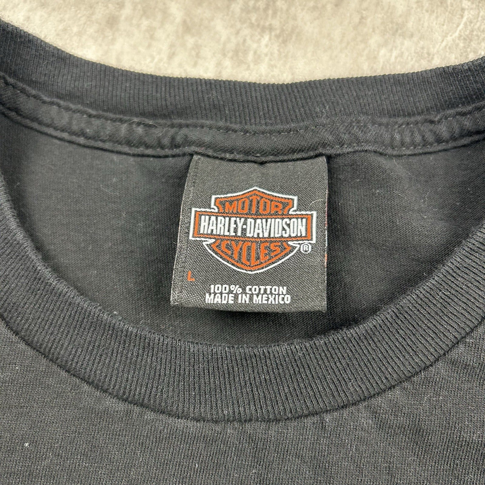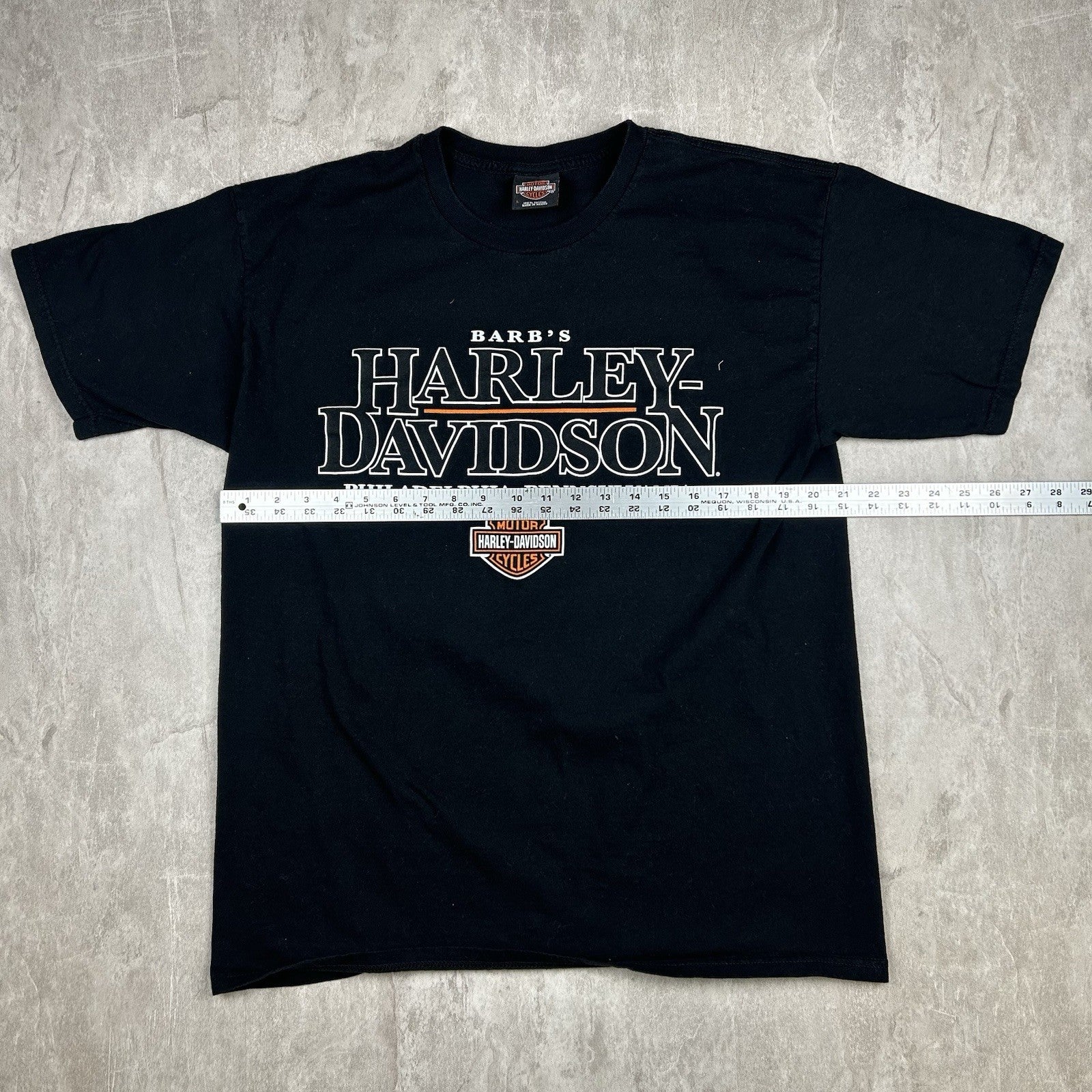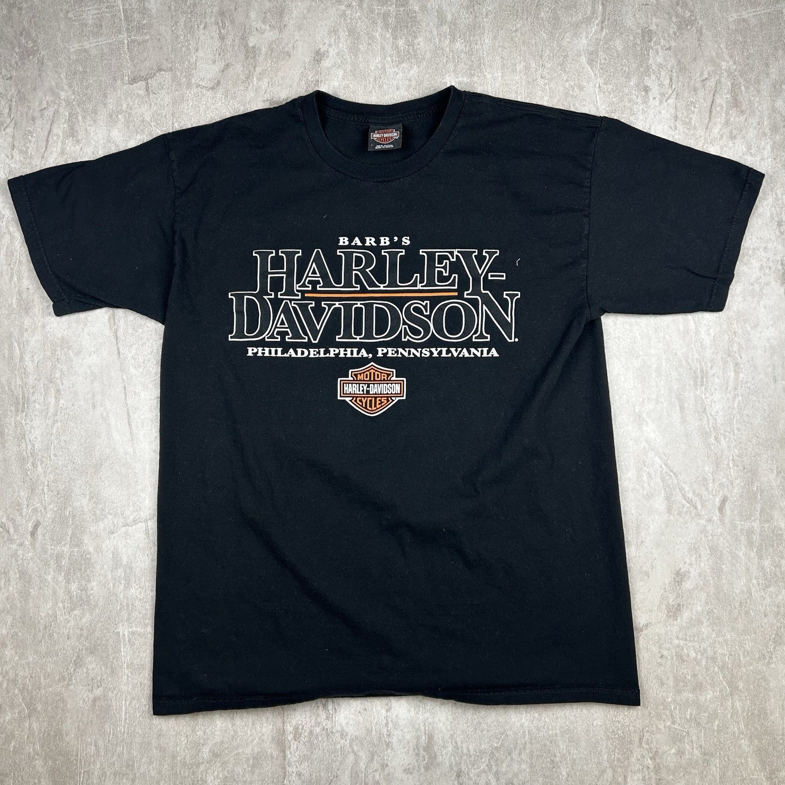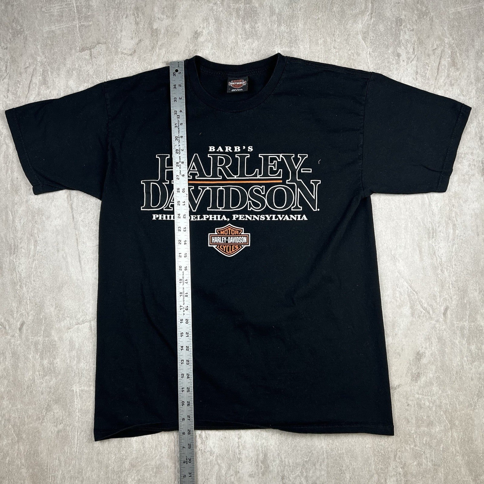 This vintage Harley-Davidson T-shirt features bold graphics from Barb's Harley in Philadelphia. Classic black design with iconic front and back prints. A great piece for collectors and riders alike. Men's size L.