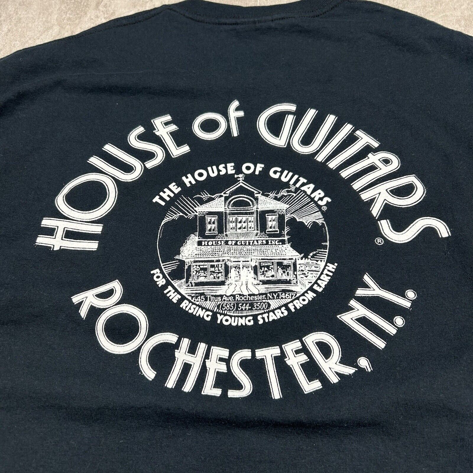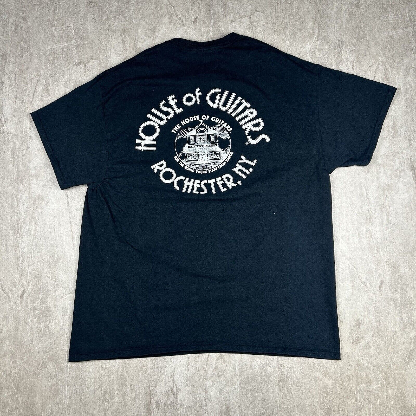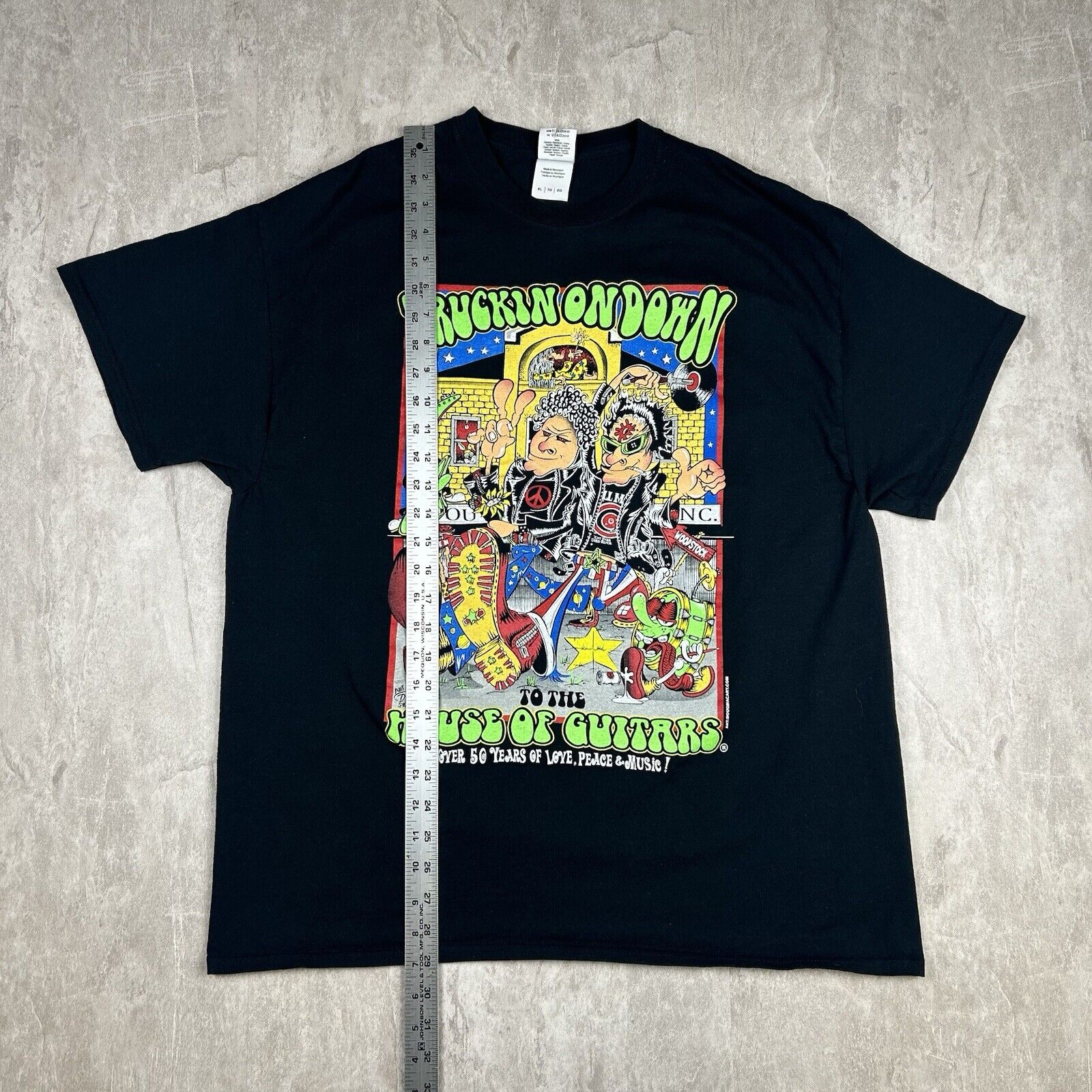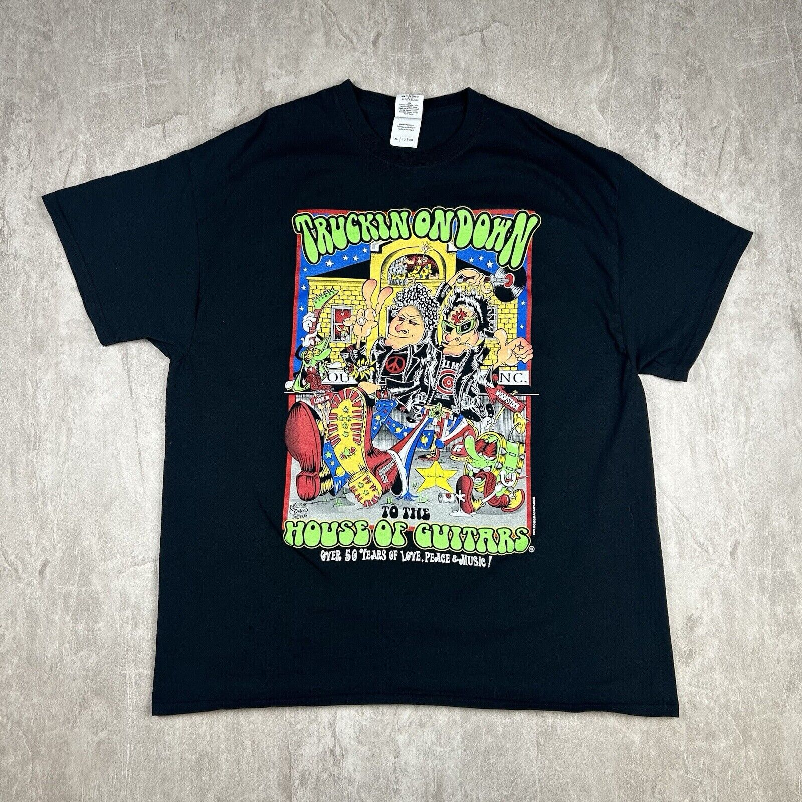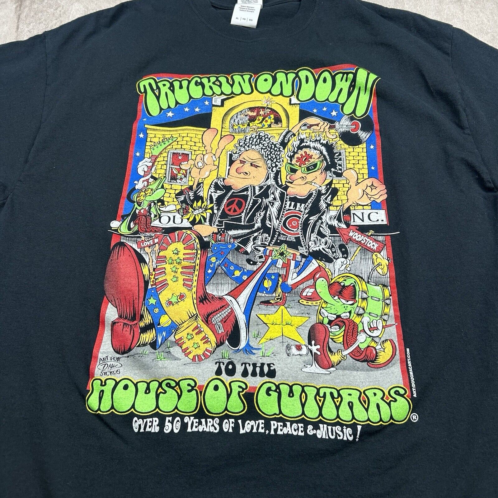 Vtg House Of Guitars T-Shirt Truckin On Down 2 Sided Gildan Black Men’s Size XL