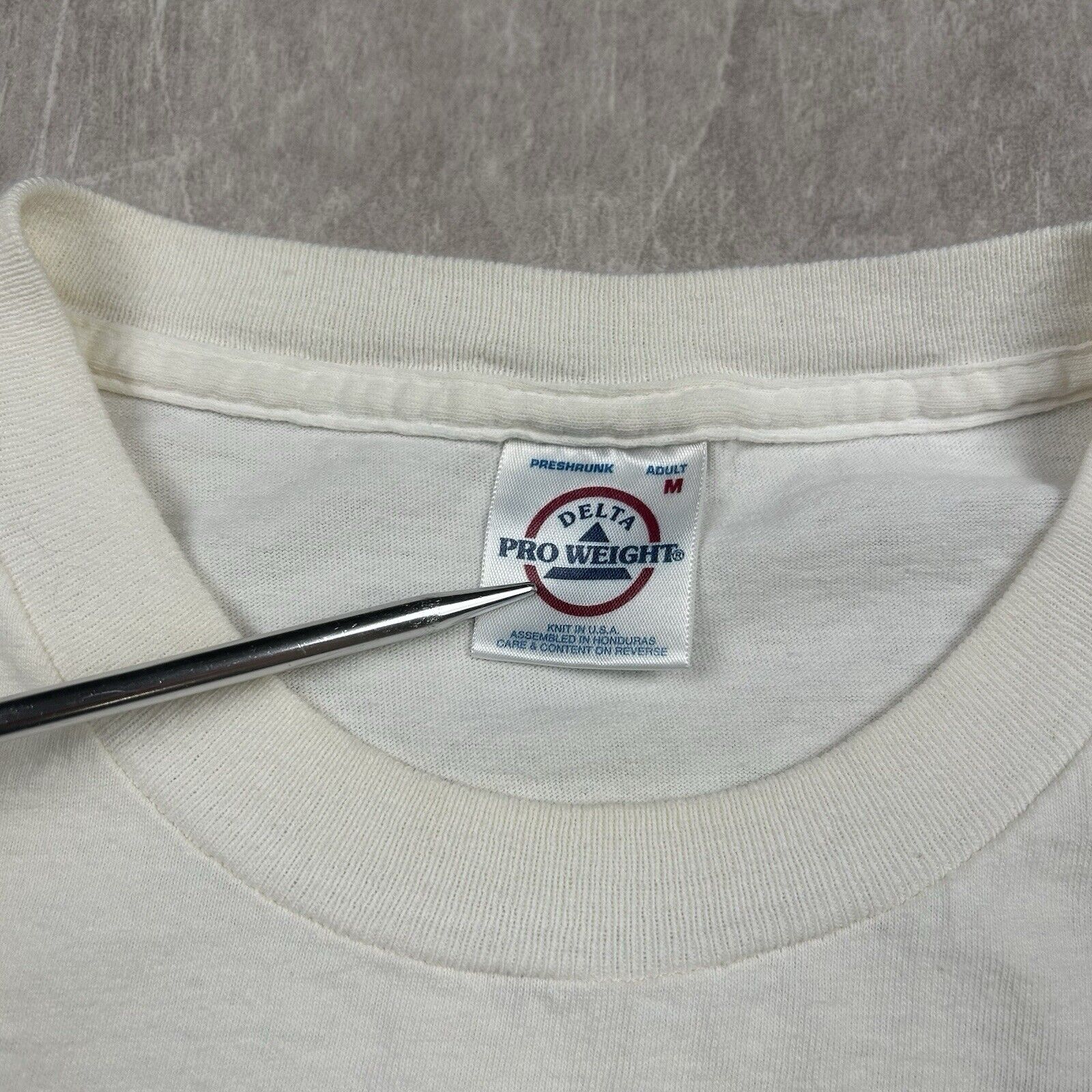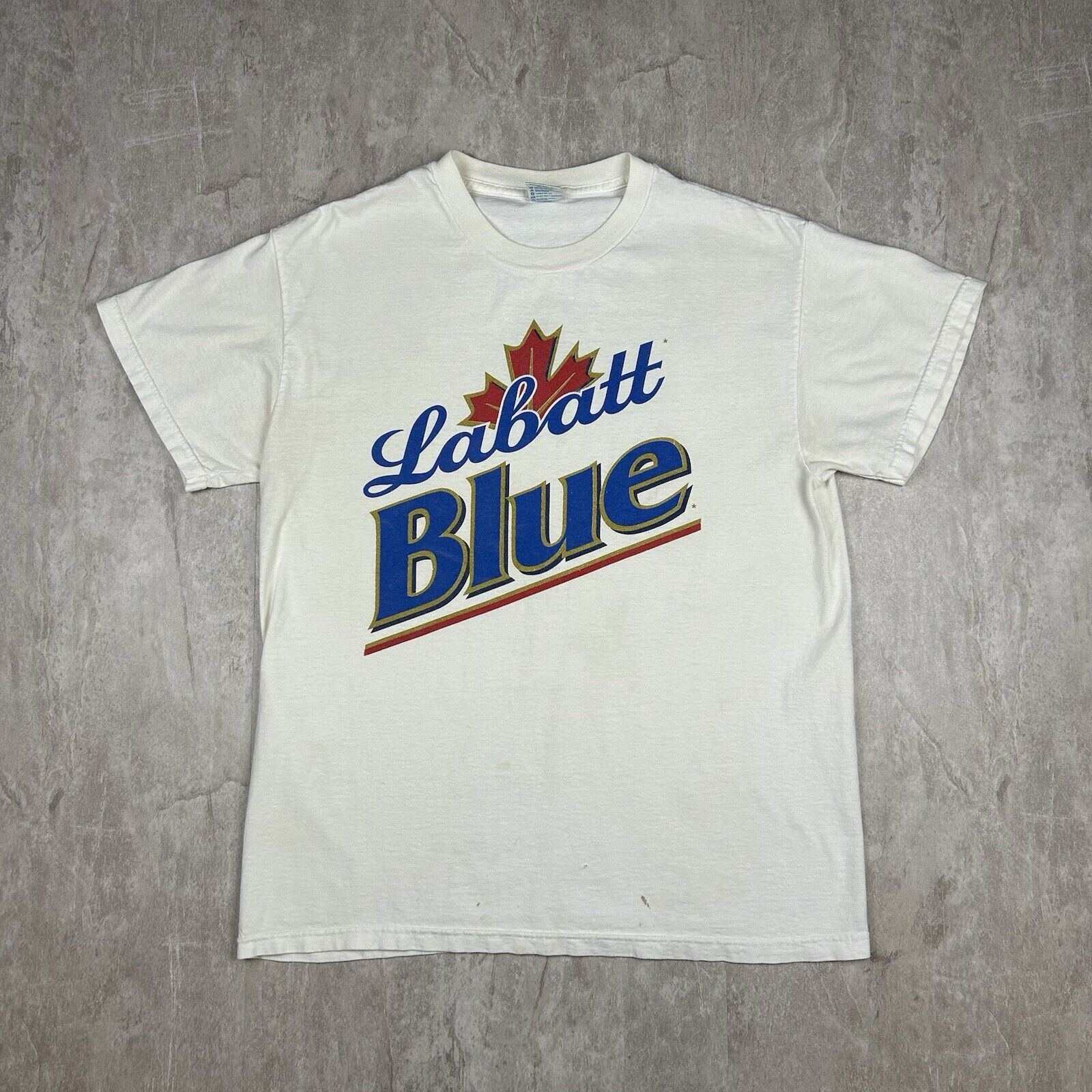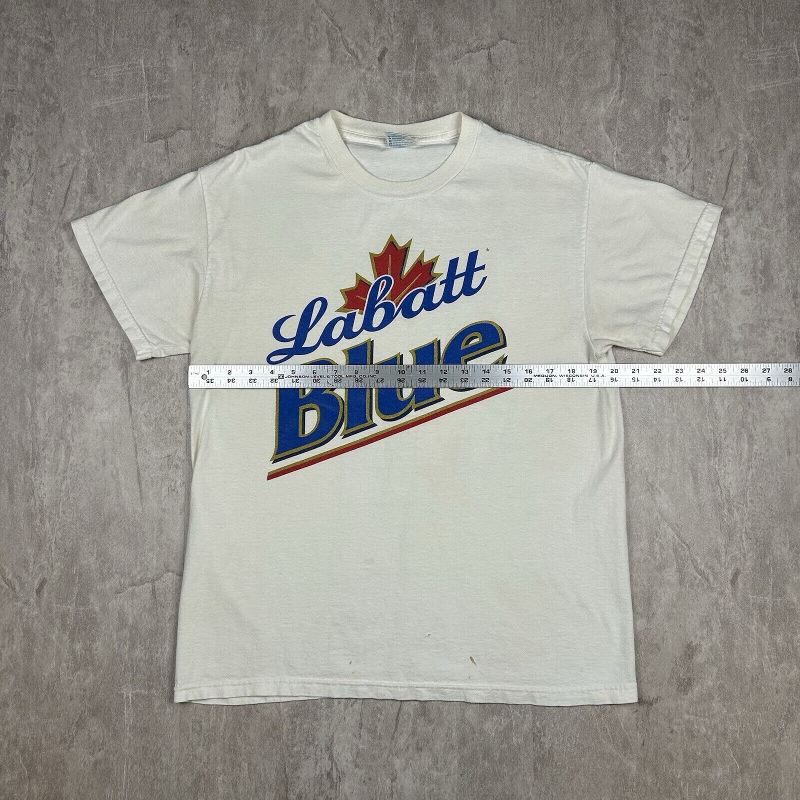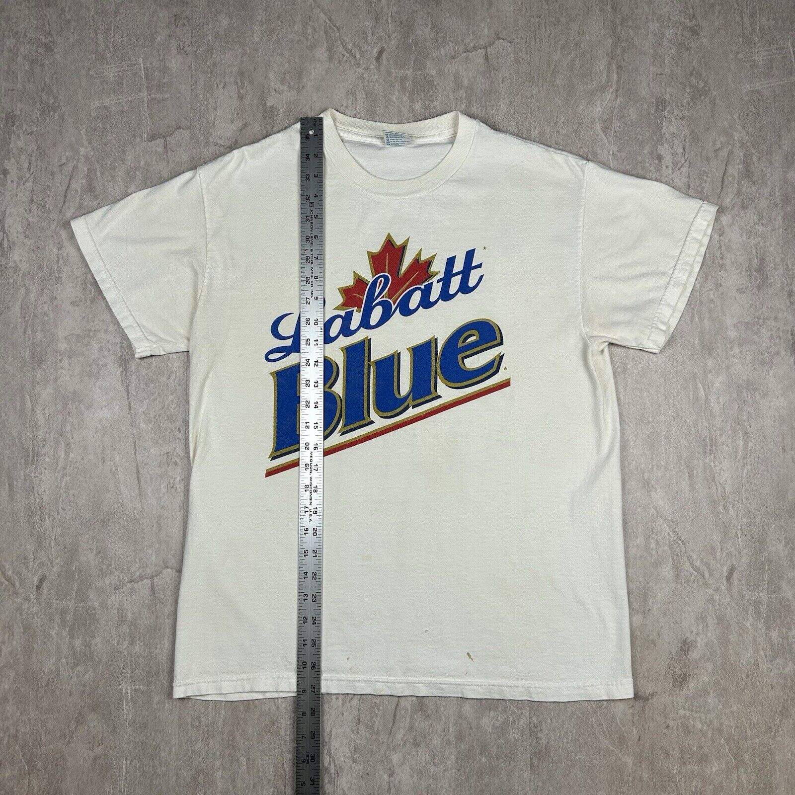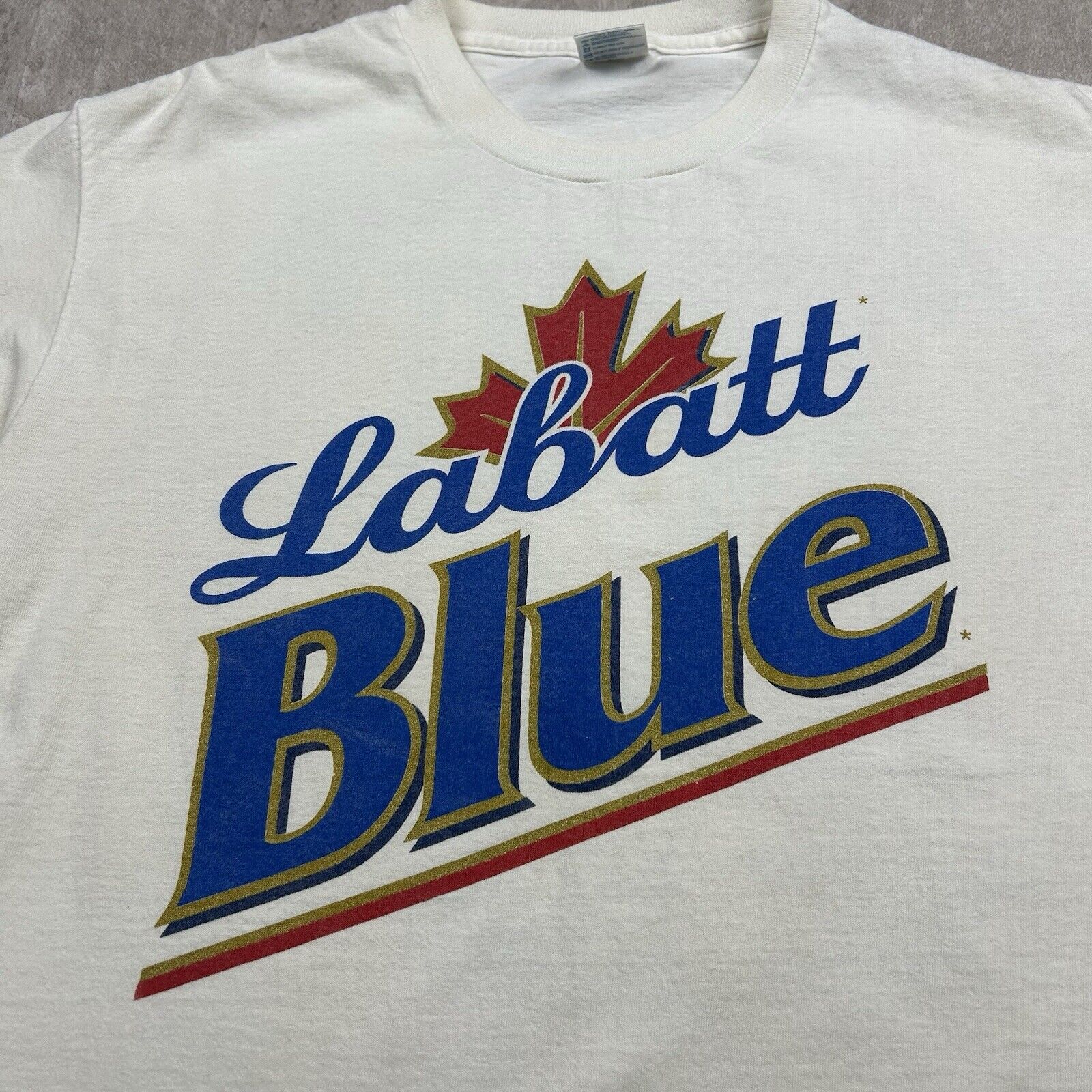 This vintage Labatt Blue Syracuse Run T-shirt in Men's Size M features a crisp white design with double-sided graphics celebrating the iconic event. Made from soft cotton, this tee combines comfort with a classic look, perfect for collectors of retro beer or Syracuse-themed apparel. A unique find for Labatt Blue fans!