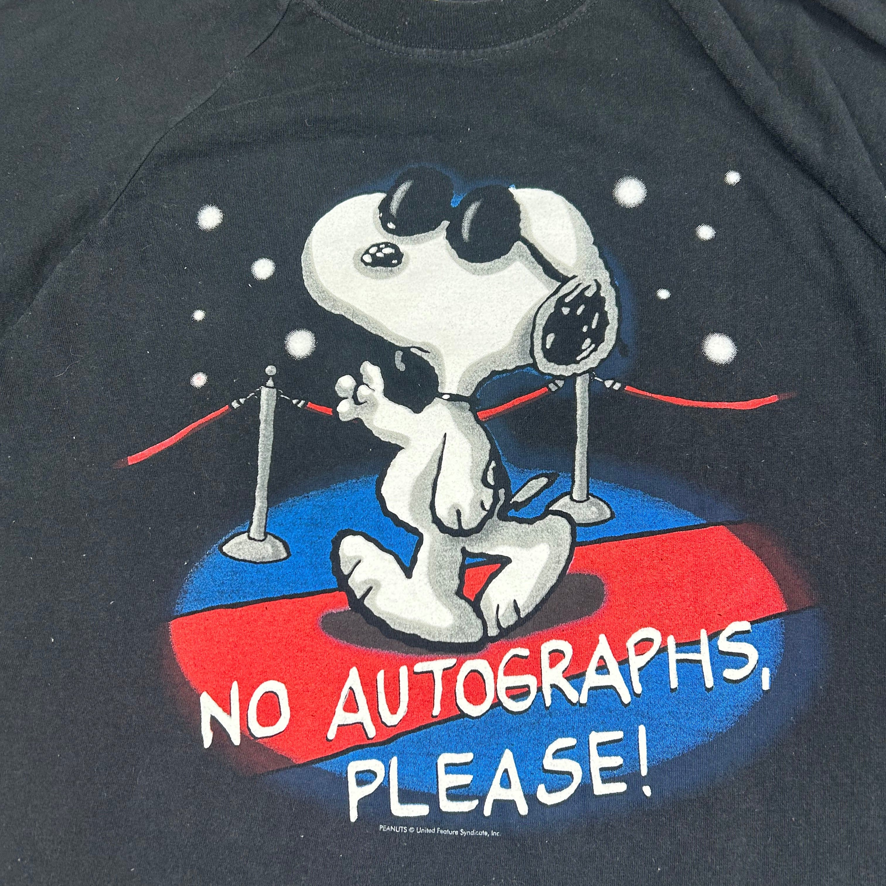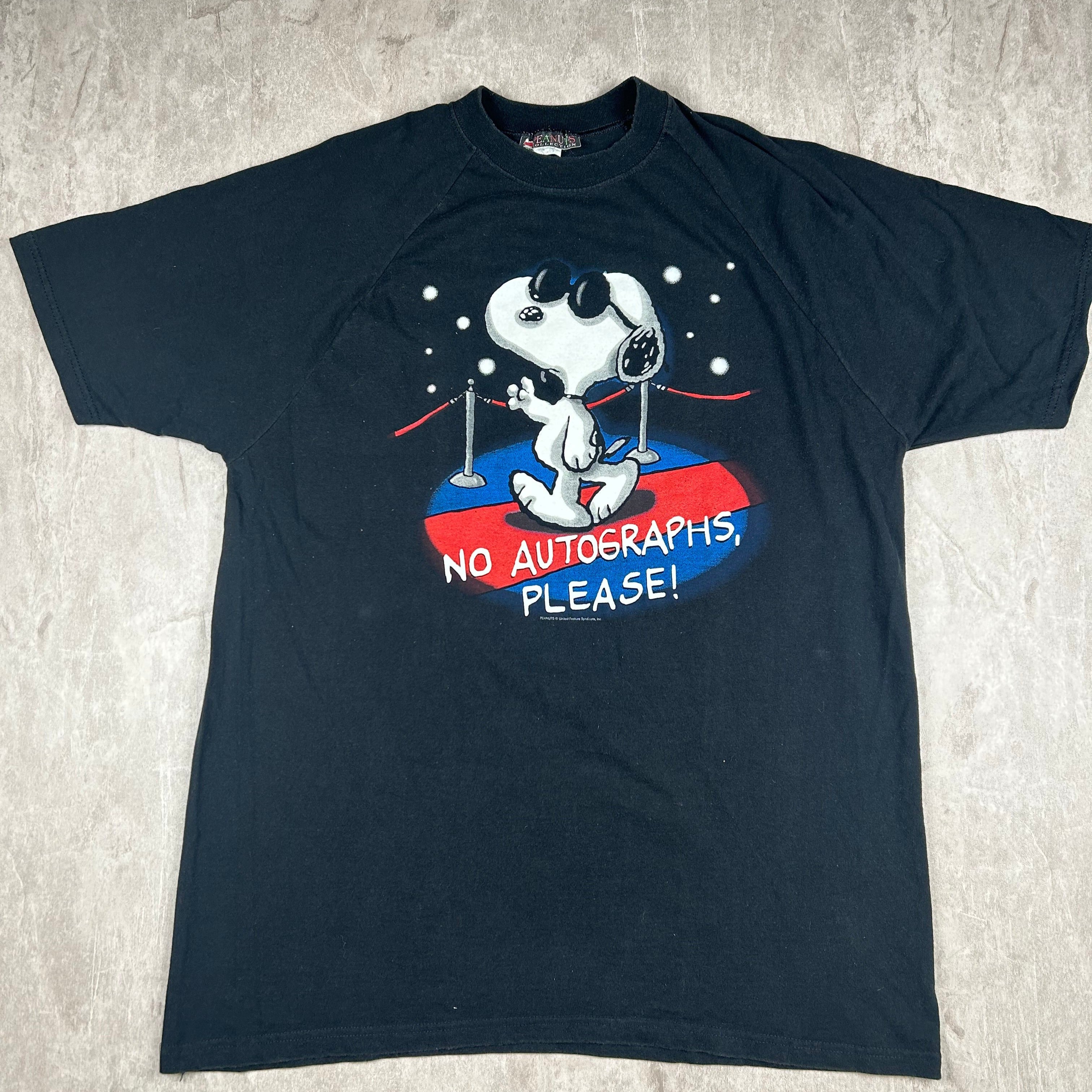 Showcase your love for classic cartoons with our Vintage Peanuts Collection "No Autographs Please" Snoopy T-Shirt. This black tee in men’s size XL features the beloved Snoopy character, making it a must-have for any Peanuts fan or vintage collector.