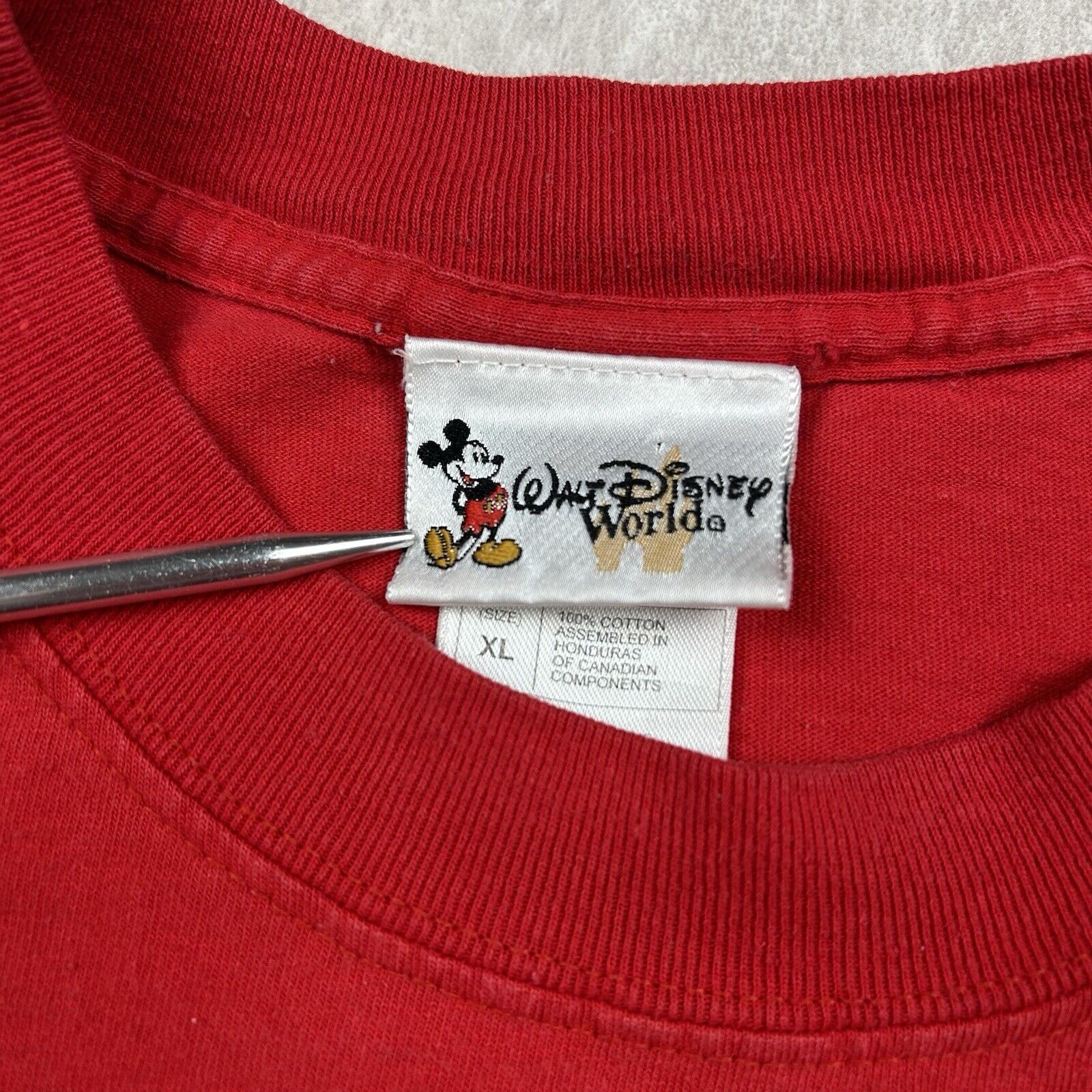This Walt Disney T-shirt in Men's Size XL features a classic red design with an embroidered Mickey Mouse and the iconic theme park logo. Made from soft cotton, this tee blends comfort with timeless Disney style. Perfect for Disney fans and collectors of theme park memorabilia!