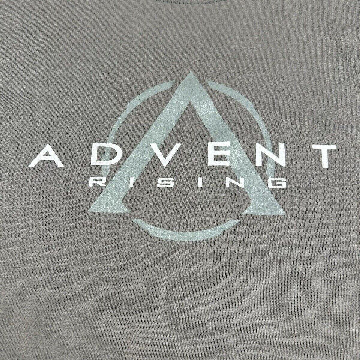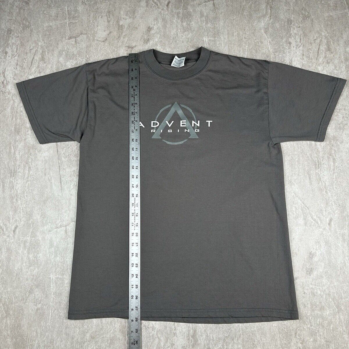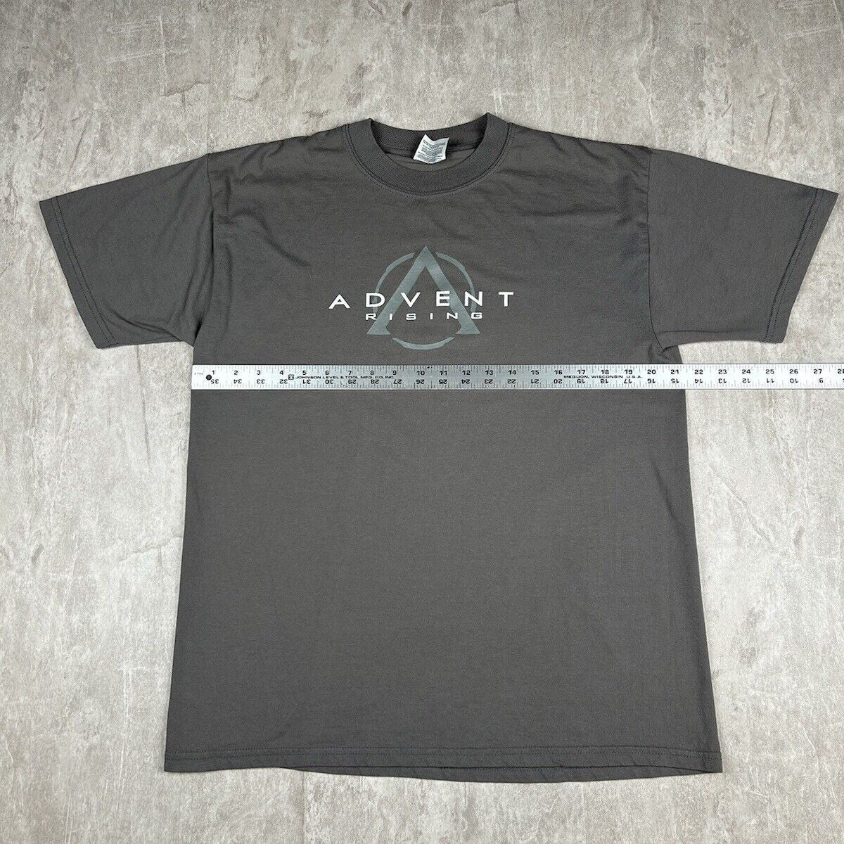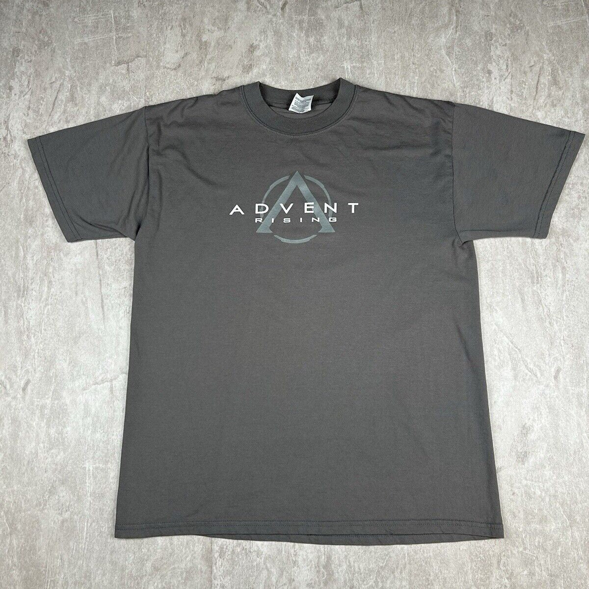 This Y2K Advent Rising Video Game Promo T-Shirt, in men's size L, features a double-sided design with graphics inspired by the iconic game. The gray tee is a rare collectible, perfect for fans of early 2000s gaming culture.
